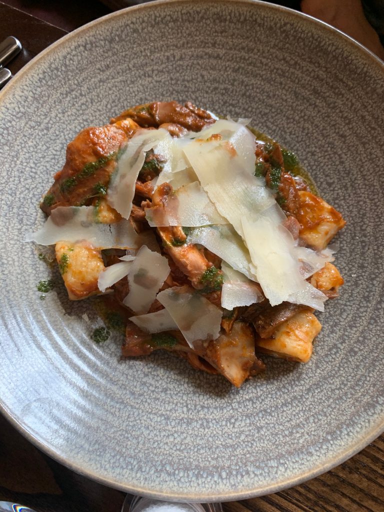 While those starters were enjoyable enough, the mains raised the bar considerably, both the lamb and rabbit dishes we chose bringing out the best of their components. Lamb Henry isn’t a cut you see on the menu too often and this portion of lamb shoulder had been braised to the point of great comfort for the recipient, if not the lamb. Simply served with a nicely presented portion of mashed potato along with peas and red wine jus, each of those elements found a strong enough voice to make itself heard. The other main was a rabbit and wild mushroom gnochhi with plenty of shaved parmesan and fresh herbs, this one threw plenty of flavour at the plate, with the rabbit and mushrooms both being bold enough while cooked to best effect. I’ve eaten way too much overcooked, tough rabbit in my time but there was no sign of such a crime here. This was a hugely enjoyable and well refined gastropub dish.