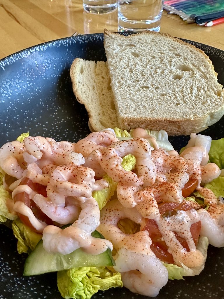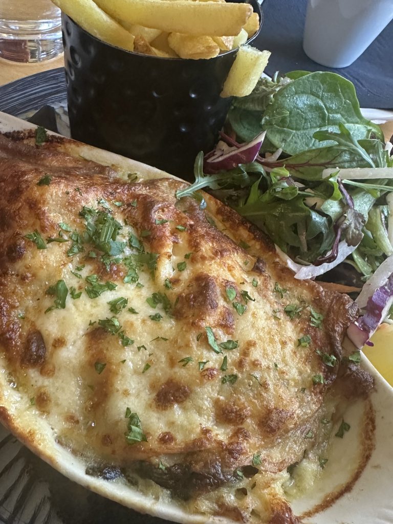 The minute steak I ordered represented something of a risk – I’m generally nervous of ordering steaks in non-specialist establishments – but this was covered with tempting bar-marks from the griddle and a gently melting pool of herb butter. Crunchy fries and a mound of bitter rocket dressed with balsamic accented the dish nicely. The seafood pancake that had intrigued me was also served with fries as well as a mixed leaf salad. The pancake itself was hidden under melted cheese and a white wine sauce, playing home to a generous mix of sea food with haddock and prawns. I enjoyed this rather unique assembly of ingredients that felt more indulgent than many seafood dishes I’ve been served over the years. We finished off with a sticky toffee pudding that carried on the theme of nicely put together, comforting classics.