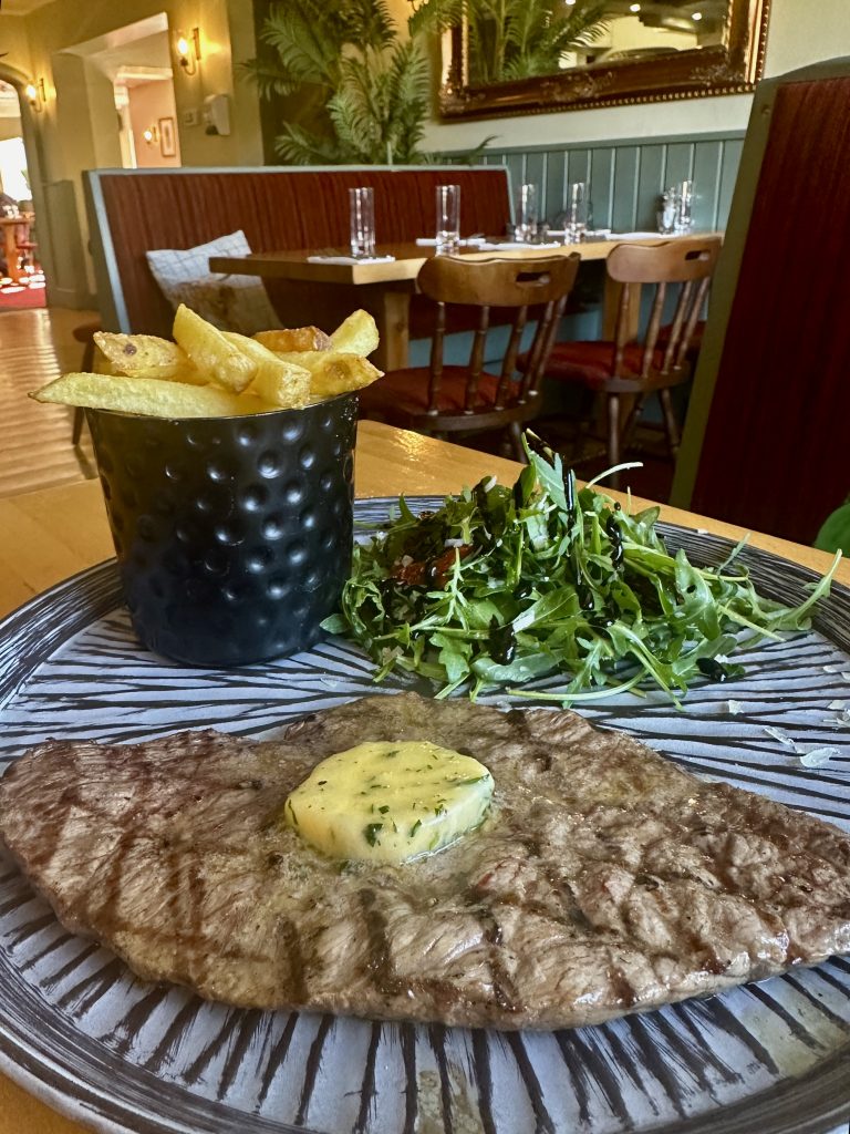 Once inside the atmosphere is calm and low key with plenty of space for diners in the open layout and an inviting bar. We were quickly furnished with menus along with colouring implements to keep Little Fork distracted. The menu is a well rounded selection of pub classics with little to intimidate and plenty of comforting dishes to choose from. Chicken liver pate and prawn cocktail got the nod for starters to be followed by minute steak and a rather intriguing sounding seafood pancake, which I gather is something of a signature at The Tiger Inn Coneythorpe. The well-appointed children’s menu yielded a hot dog in due course which went down well while we set about starters. A classic prawn cocktail can be a light and refreshing preamble to a main course with a fresh crunch of lettuce underpinning sweet prawn and Marie-Rose; this was a well put together execution that served its purpose well. Chicken liver pate needs something to bring out the best qualities of the dish and the bitter rocket with red onion chutney did the job in this instance, another satisfying classic.