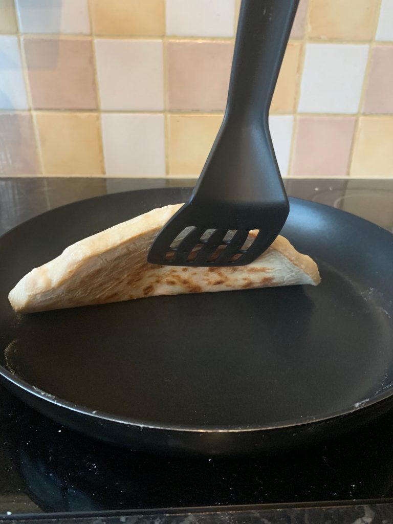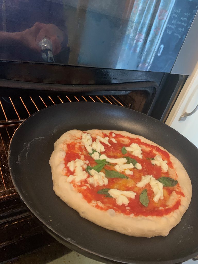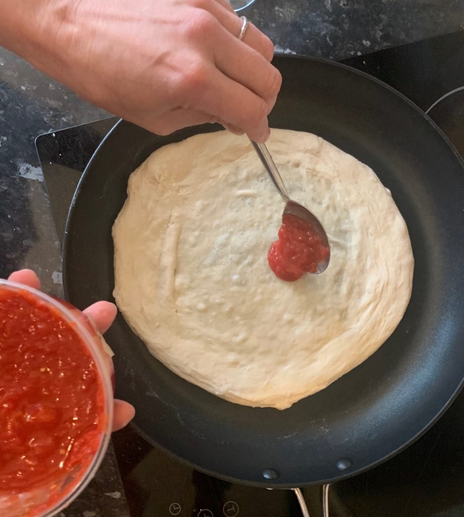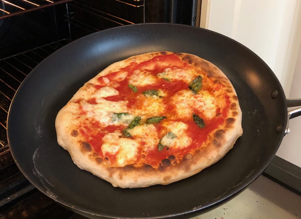 Up until this point we’d not really deviated from standard pizza production but the lack of a pizza oven in our domestic kitchen was about to push us down a different route, the clue rather being in the title. The trick to this technique would be to combine a hob and a grill to effectively cook the base and toppings so while stretching the dough, I’d got a frying pan as hot as practical and the grill pre-heating. With the base successfully transferred to the hot pan, further assembly was straightforward and included quality San Marzano tomato, Fior de Latte & parmesan cheeses as well as a drizzle of olive oil and basil leaves. Thankfully this wasn’t too much of a race against time to complete while the base took on some colour and I was soon ready to shift to the grill and give the cook some symmetry.