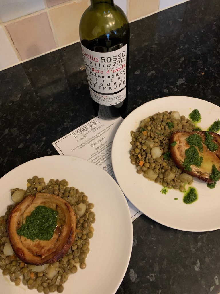 Everything was neatly & logically portioned and ready to go so a few hours later we were happily in the process of getting everything reheated for our meal. The first course was a soup of onion and cider along with Cochon sourdough bread rolls that paired up nicely with a Verdejo, coincidentally from sister establishment Cave Du Cochon. The bread gave the course substance, accenting the soup’s balance well and allowing each of the main elements to shine before we moved onto the main event of belly pork stuffed with sausage meat, apricot and breadcrumbs. This one was served with “Lentils Petit Salé” and green sauce that weren’t too taxing to get onto a plate, effectively being to get the pork into the oven on a hot enough heat to blister the skin into crackling while reheating the lentils in the microwave. We had to give the pork a few extra minutes to bring the skin to its full potential, an unavoidable variation from a domestic oven I suspect.
