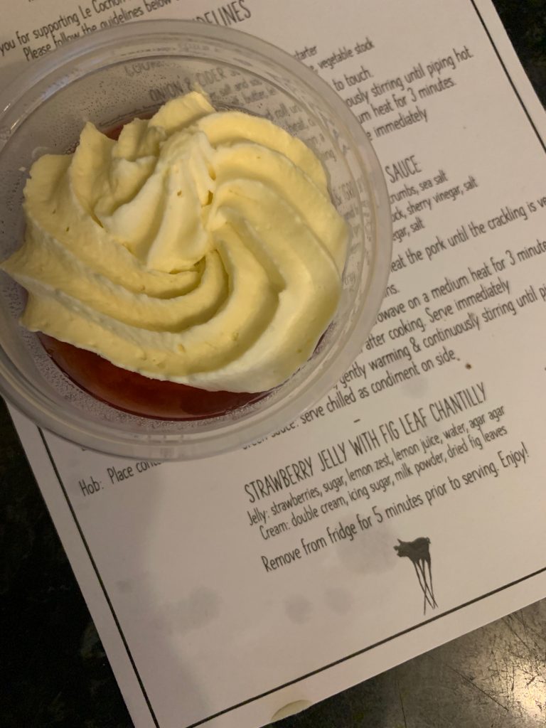 The format is similar to that which I enjoyed from Roots recently, a three course meal delivered to reheat at home which Cochon augment with a bottle of wine (or non-alcoholic alternative). This meal for two with wine comes in at £45 including delivery, an extremely fair price for food from a chef who showed so well on Great British Menu just a couple of years ago and whose establishment has been tipped to receive a Michelin star. Predictably enough it’s been selling rather well too, so I jumped to it when my diligently-set phone reminder went off.
