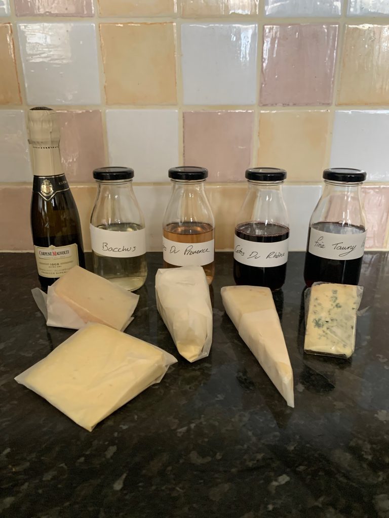 We signed up without hesitation, thinking that £40 for a couple seemed perfectly reasonable for a selection of 5 paired cheeses and wines delivered to the front door. These arrived as promised the day before the event was due to take place, giving me plenty of time to figure out if I could come up with 10 presentable wine glasses and what constituted essentials to augment the cheese in as far as our permitted shopping sorties allowed.