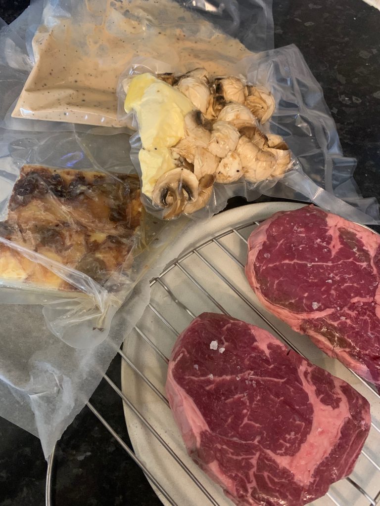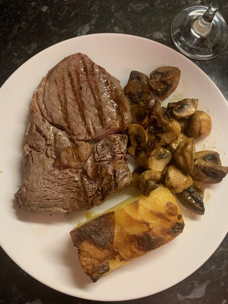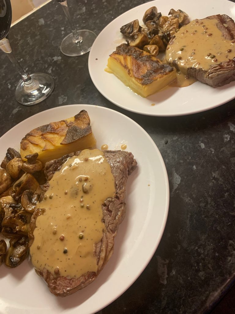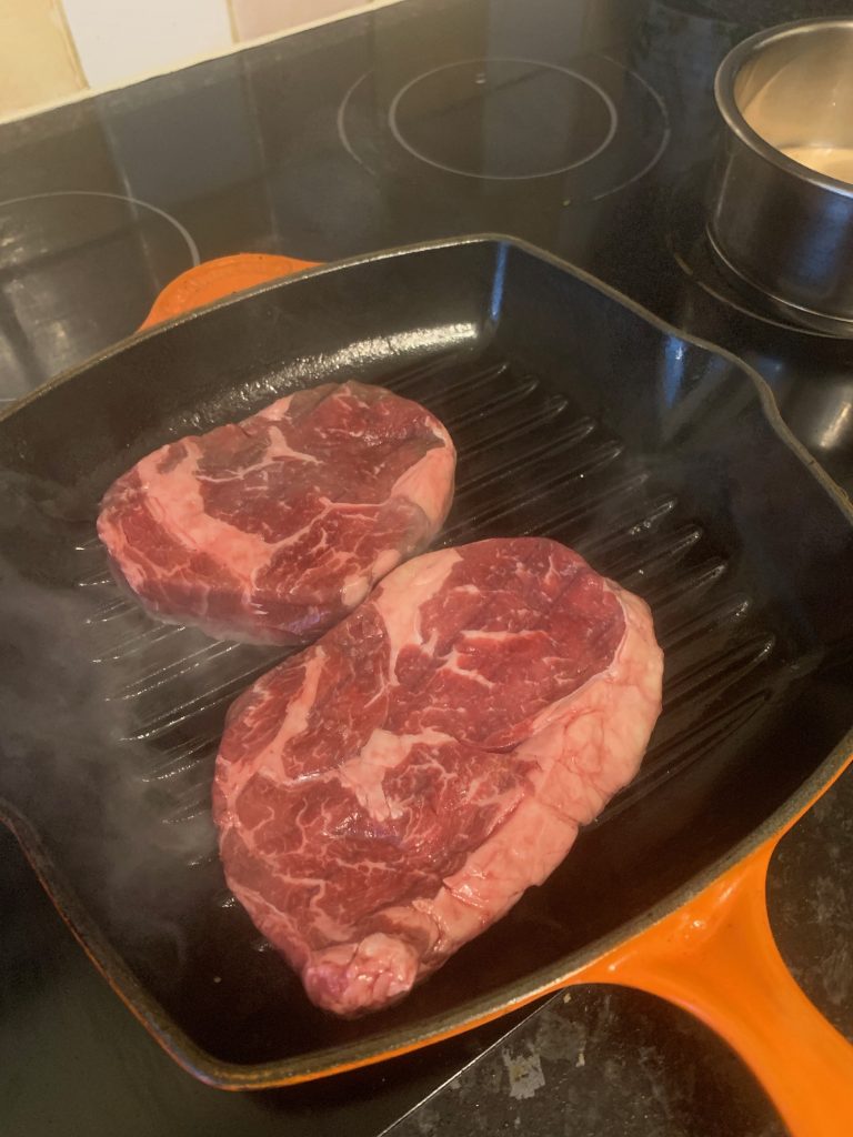 As you can understand this is a fluid situation, so check The Whippet Inn social media for the week’s menu but expect to find Sunday roasts and steaks at the core of the offering. I was lucky enough to bag a brace of ribeye steaks that came with dauphinoise potato, garlic mushrooms and a peppercorn sauce that came in at £30 for two portions. These came with practical instructions to get all your goodies onto the plate quickly, taking you though a series of steps designed for maximum concurrency in order to shorten the process. First I made sure the steaks would be at room temperature and well seasoned by the time they would hit the pan before kicking off the longest process, popping the portions of dauphinoise into the oven. At the same time, I got the sauce into a pan ready to heat slowly and heated my trusty griddle.