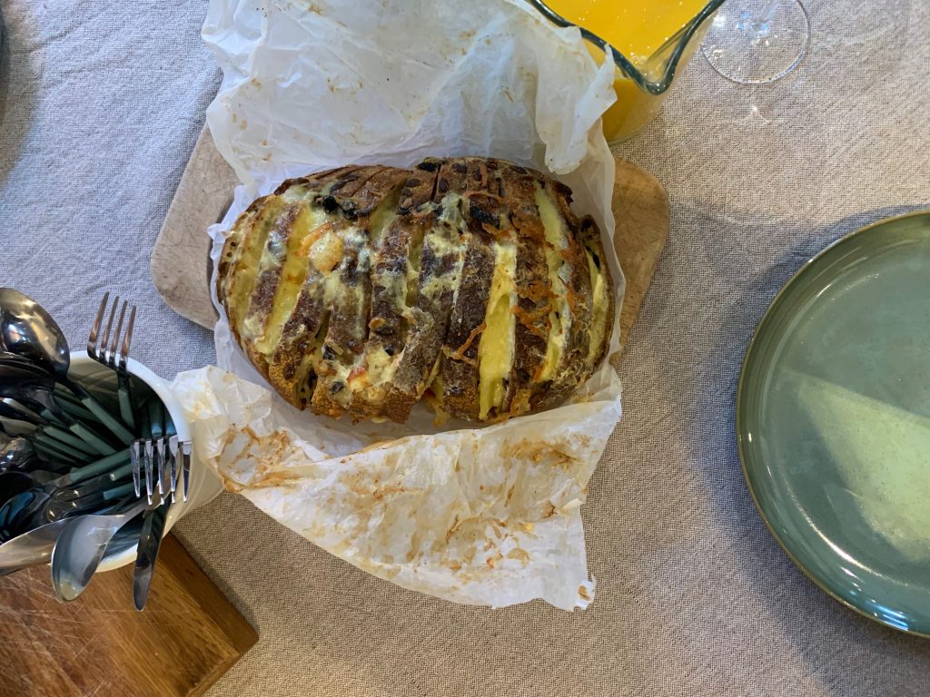 Clearly you want to come away from a course like this with some verifiable skills to show off to your friends, but that’s not to say there isn’t time for a bit of indulgence in the form of lunch and a glass of wine. Clearly bread wasn’t in short supply, so our host used it as a centrepiece, turning a loaf into something resembling a hedgehog… or perhaps a hasselback loaf with cheese forced into its cavities? We enjoyed a fresh salad to break up the carbs along side this before getting back to work.