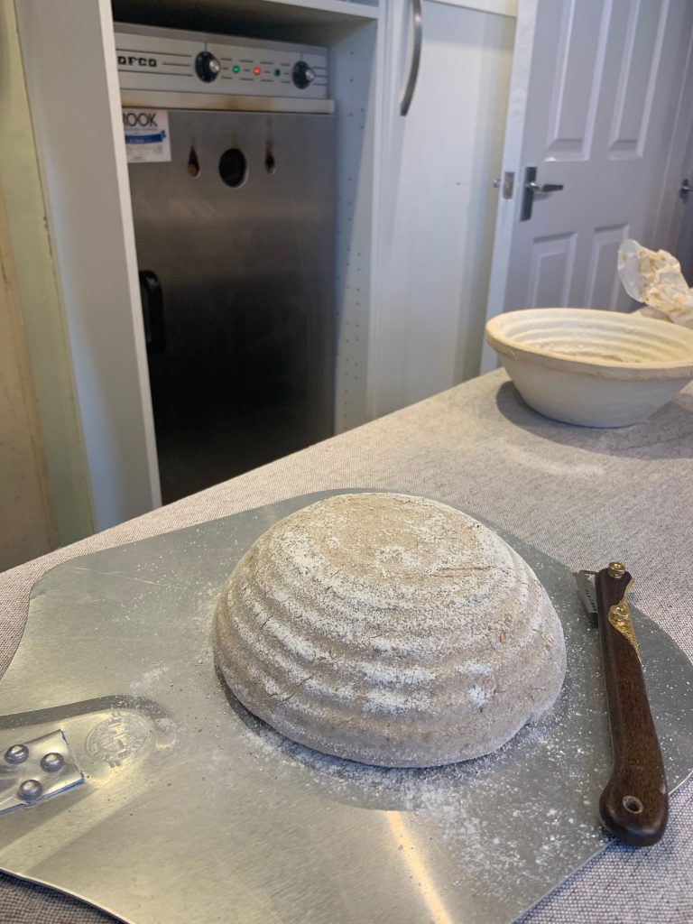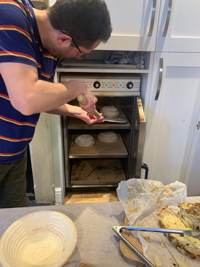 The final steps were of course to get our loaves into an oven, around which we were happy to learn more of the impact of steam on the crust of the fruits of our labours and how to learn the quirks and characters of our ovens. With the oven taking over the hard work, we again took the opportunity for refreshment, tucking into a delicious dahl that is available for delivery as part of Phil’s service. I can see why he was keen to show it off.