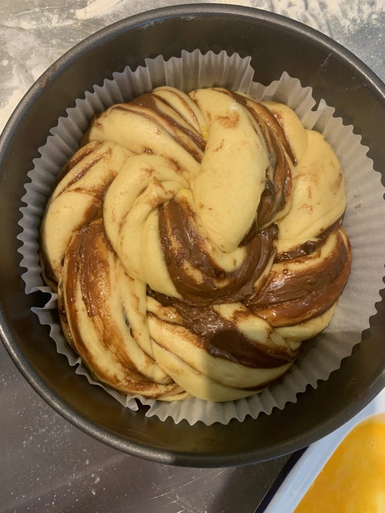 Suitably refreshed and with enough energy to embark on more kneading, we got ourselves back into the kitchen to work with our doughs that had now proved. We were lucky enough this day to have the opportunity to produce a babka alongside our savoury loaves that involved a relatively complex operation to tease the dough into plaits to facilitate a pleasingly fancy looking treat. I’ve got to confess that enthusiasm overtook competence here and that the pic is of a fellow attendee’s efforts.