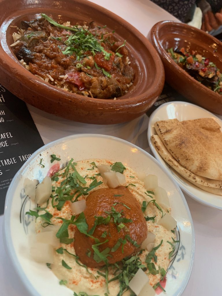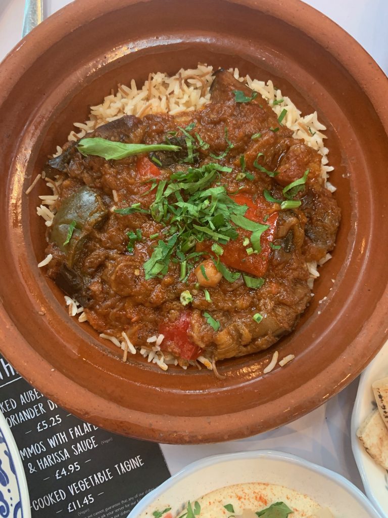Our food arrived quickly along with a glass of their Lebanese house wine, vegetable tagine, falafel with hummus & harissa sauce and coriander dressed baked aubergine all present and correct. The aubergine threw a good punch of heat that didn’t overwhelm the coriander or distract from the vegetable and the falafel was far from the powdery, dry examples sadly too common. Hummus is generally a good thing, remaining so here and the vegetable tagine was a delight that packed in depth of flavour against a backdrop of varieties of rice that broadened its texture and flavour. The spinach Fatayer was probably a step toward over indulgence in a light meal for two, and took us a step away from the vegan theme thanks to its inclusion of feta, but thematic misstep or otherwise was as enjoyable as last time.
