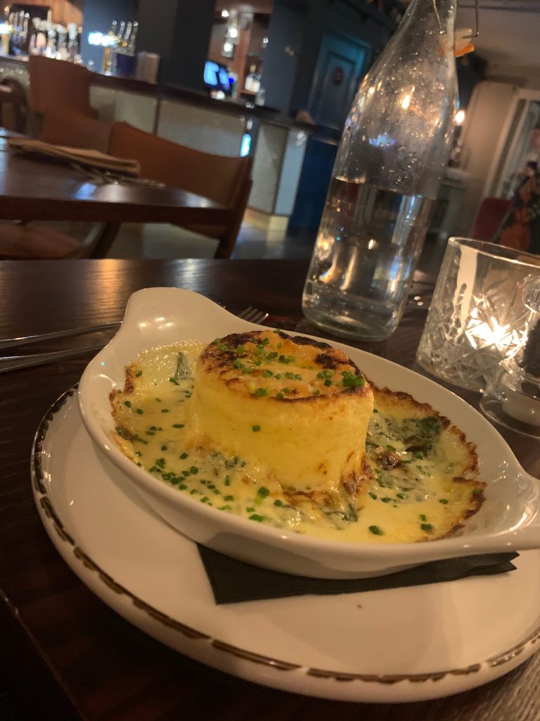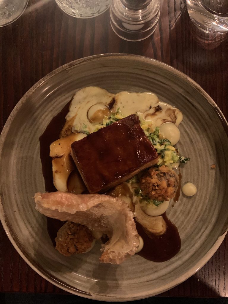 After forcing ourselves to take on a couple more wines to pair with our mains, we were treated to baked cod loin with mussel and winter veg chowder and pork belly with black pudding croquette, creamed cabbage, apple puree and pork sauce. These were both the epitome of well presented, hearty gastropub food that put together just enough refinement with bags of flavour and hearty portions. The fish hit all the notes I had hoped for, the lightly curried broth and generous piece of fish working with spinach and root veg to make a deceptively filling plate of food. Pork belly is one of my favourite cuts when it’s done justice, something that is certainly achieved here. Black pudding bonbons are a great addition to the plate along with a stonking great shard of crackling that could have functioned as a shield in some weird porcine fencing contest. Creamed cabbage and a potent, though not overwhelming, apple sauce finished things off well.