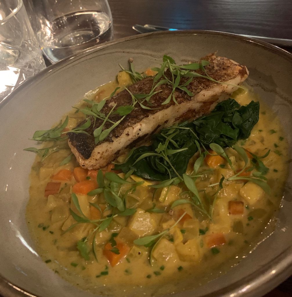 After finishing our drinks and placing our orders, we were led to the dining area, which while busy didn’t allow tables to be too crammed together. We’d plumped for a soufflé made with Fountains Gold and a celeriac veloute with mushrooms and truffle which were served quickly along with well matched glasses of wine. It’s been a little while since I had a soufflé and the wait was well rewarded here, the dish being just the right balance of rich flavour and light texture. A creamy spinach sauce finished it and left flecks of melted cheese around the edge of the plate to pick at. Celeriac, truffle and mushroom would need something bad to happen for there to be a problem with that combination and unsurprisingly nothing was untoward here. The sautéed mushrooms hid under the veloute to be wheedled out and enjoyed with the fresh bread served on the side. There could have been more of a punch of truffle but we greatly enjoyed both dishes, our anticipation for the main courses only increased by them.