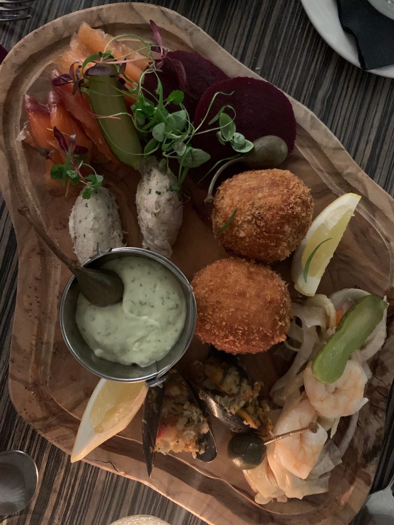 The Land & Sea Banquet took the form of three platters to share between the two of us, seafood first followed by meat and vegetables before a dessert to finish. The seafood platter featured smoked salmon from Bleikers along with mussels, mackerel, crab, prawn and dill bread. The dill bread sat happily underneath smoked mackerel pate while pickled beetroot gave breadth to the fish elements. Bleikers salmon was as good as one would expect and it didn’t show up any of the elements prepped by the guys in the kitchen. Baked mussels were subtle as was prawn escabeche and the crab Scotch eggs were generous with the star ingredient.