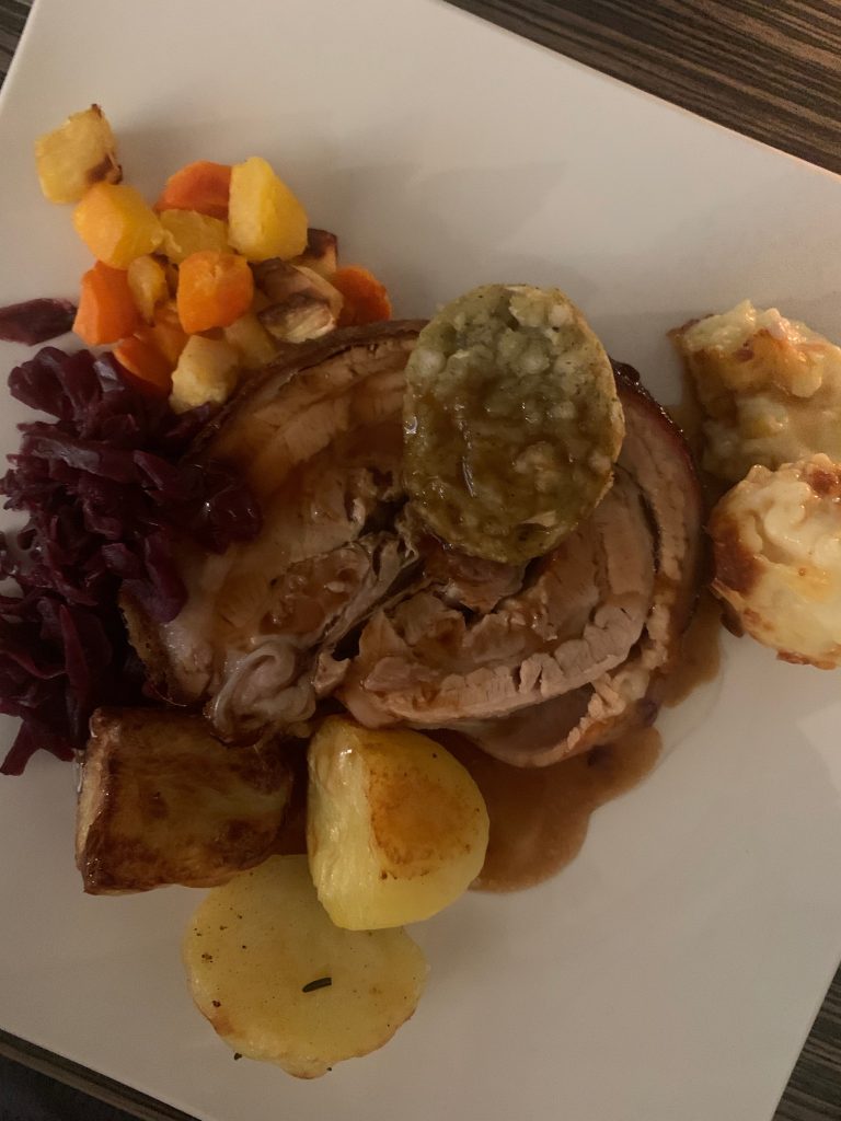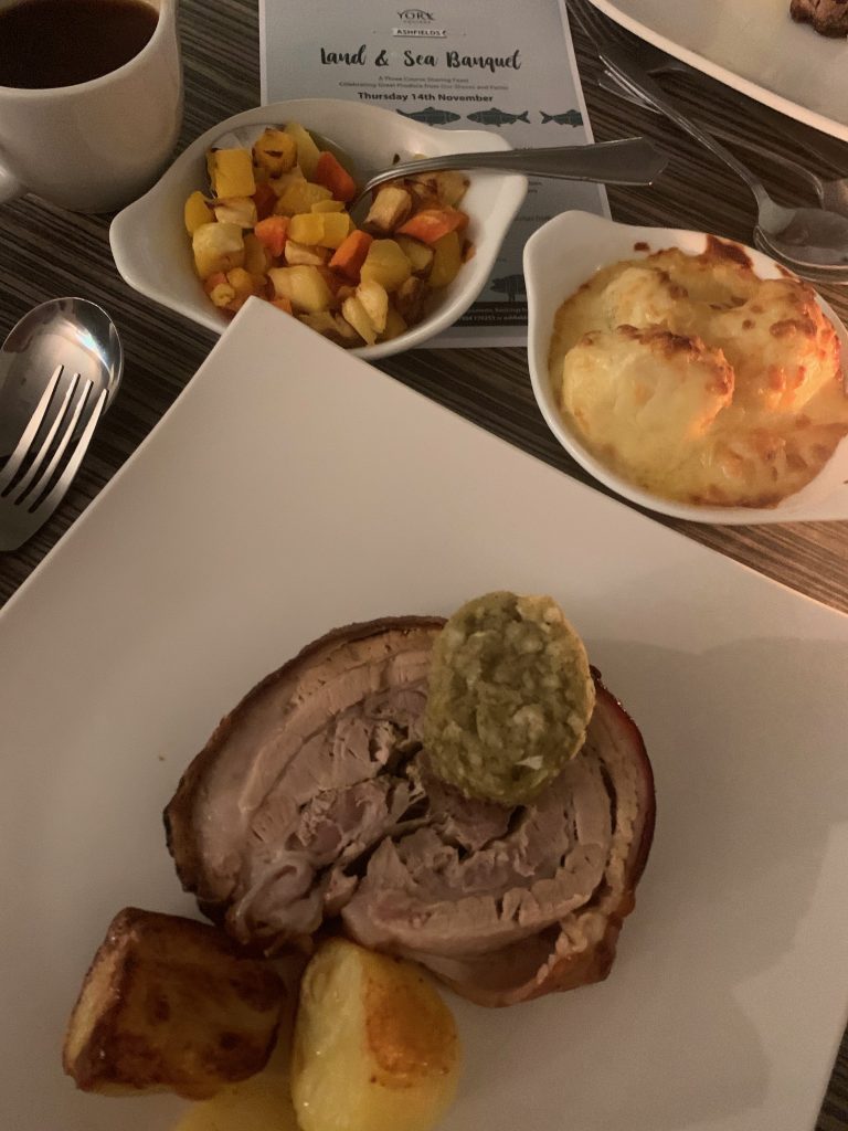 The headliner on the ‘Land’ platter was porchetta which was carved by the students in the dining room as the centrepiece of the evening. It was served with roast potatoes, stuffing, root vegetables, red cabbage and a particularly luxuriant cauliflower cheese. The porchetta wore a beautifully judged layer of crackling around its succulent meat and paired delightfully with those roast vegetables.