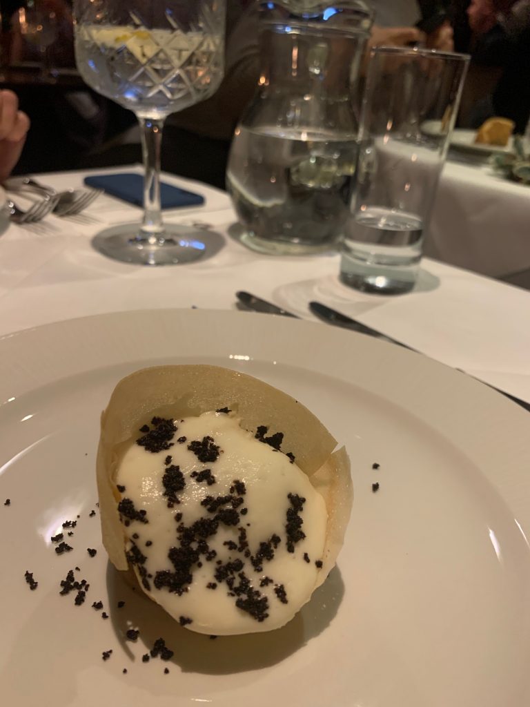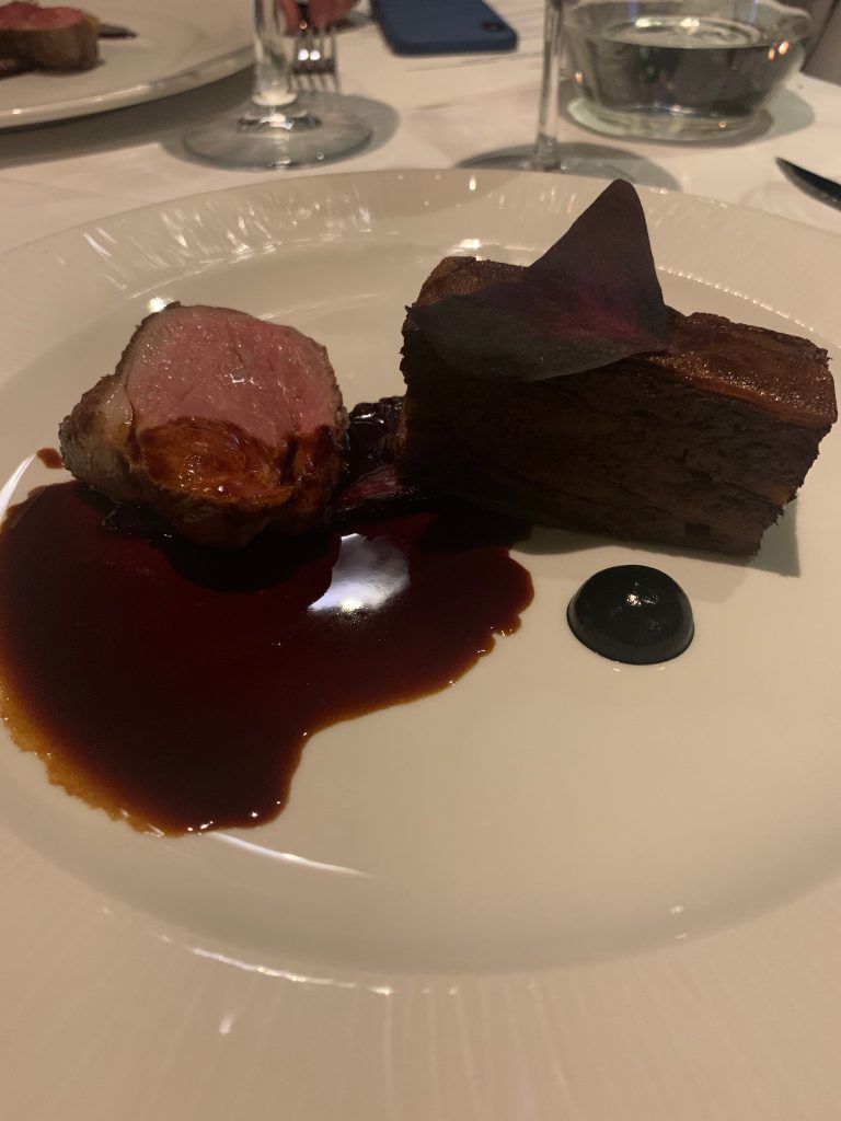 We continued with a course of cured cod loin with lemon and parsley which made good use of a shard of chicken skin for breadth, before indulging in a lamb dish of uncommon depth. This plate was a real treat that chucked plenty of black garlic into the mix along with red cabbage and a treacherously enjoyable jus. This combination of a finely layered terrine and a perfectly cooked piece of lamb shouted the old maxim “fat is flavour” at every mouthful and will be lodged in my memory for a good while.