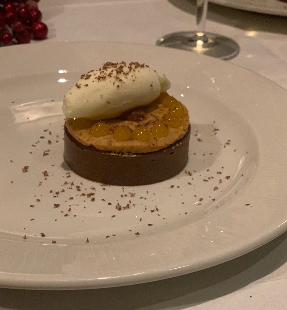 Having cleared a path through the savoury courses, we were next presented with a roasted cobnut porridge that featured quince and honey. Desserts are unlikely to ever take precedence over savoury in my preferences, but this was original and packed with complementary flavours. Last up was caramel shortbread with creme fraiche ice cream and dots of a sharp citrus fruit based gel. The chocolate on this one was described as bitter, something that it delivered on notably. While certainly aggressively bitter, the ice cream and caramel did the hard work of tempering that to bring things back in balance.