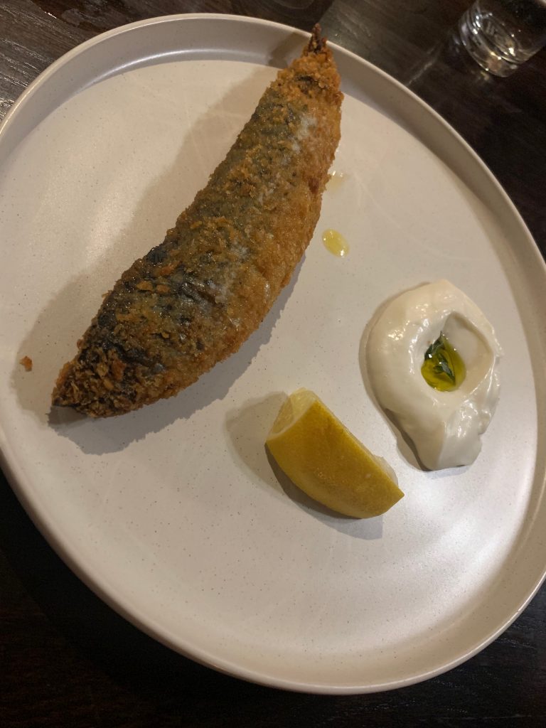 Next I waited for a mackerel kiev to arrive for my first course. This dish was a refinement of one of those popularised at Spark, presented here looking like a whole fish but filleted to allow us to just get stuck into the aioli it was served with. The transition to a covered venue has served only to enhance this one and the combination of the strong fish and garlicky dip remains as alluring as ever.