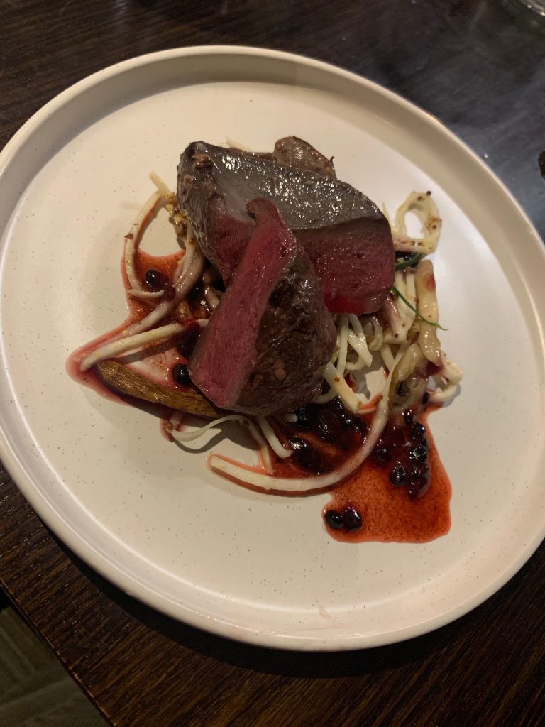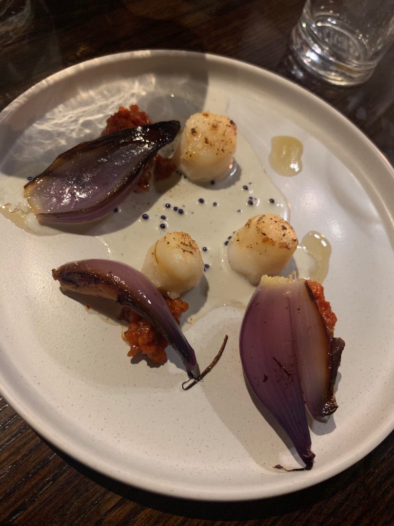For the next course, we moved onto meat with a pigeon dish that relied on remoulade and berries to balance the weighty flavour of the meat, further depth coming from a few mushrooms. Overcooked pigeon is a terrible experience but the required delicacy of touch and technique was in evidence here, making this the rare treat of perfectly cooked pigeon – something not seen on menus often enough. Next up were scallops with caviar cream, shallot and a generous spicing of Nduja to tie everything together. The caviar cream was a subtle embellishment that could easily have been drowned out by the Nduja’s heat, but the centrepiece scallops stood up to the task in hand, though the presentation suffered a touch on this one as the small scallops looked a bit lost. I gather they’ve subsequently been replaced by larger examples.