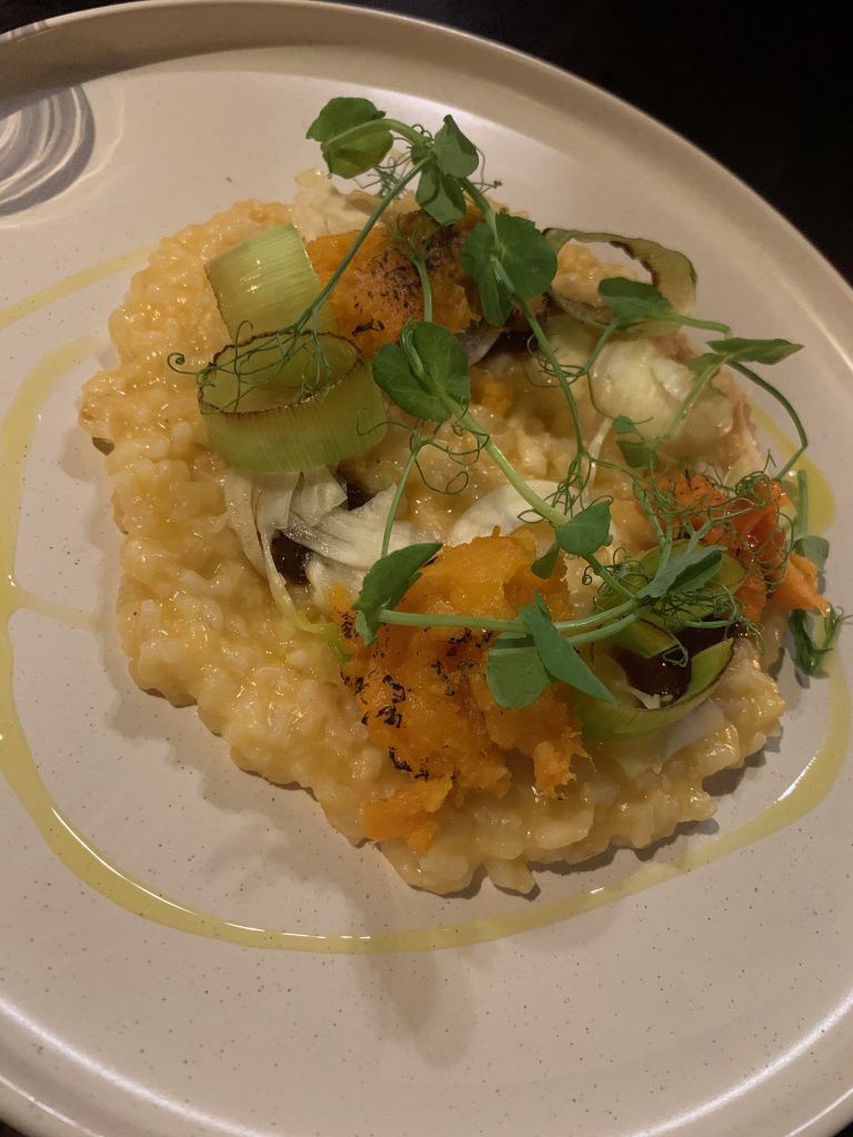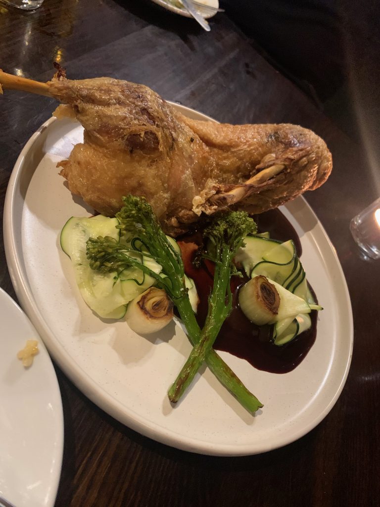 We then moved on to a vegetarian dish, a risotto of squash, sweet potato and leeks that while justifying its place on the table wasn’t as memorable as what had come already or was to follow, a half duck with greens and an unctuous jus. This one really let the meat shout its advantages. I didn’t manage to pick up the details of the cooking process but “One Day Cured” is apparently just the right amount of curing to produce wonderfully tender duck that it’s a pleasure to pull off the bone and make a mess of oneself with. Hasselback potatoes are an indulgence I’ll chase any time, so I kept snacking on those as Skate wing appeared at the table served with a Veronique sauce. We finished up with a paper bag of sweet beignets and a sense of fulfilment after our meal.