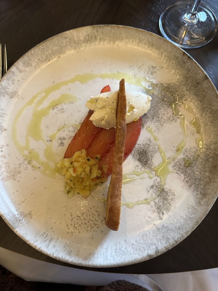 The opening of Amber’s a few months ago set it out as a luxurious dining room in which hearty, not unduly fussy, food could be enjoyed. As such it was a pleasure to reacquaint oneself with the space and say hello to our server Jack, who by coincidence is an old friend of mine. We took up residence in a comfortable booth and submitted our orders, taking a note of the kids menu, which wasn’t shown on line, as well as the option to order a kids’ roast. Glasses of wine quickly arrived and we settled back for starters of pig cheek and salmon. These appeared in the white-gloved hands of suitably decorous servers ready for us to set about them. I’m always slightly dubious about the need for a starter with a Sunday Roast, which should be enough to satisfy in itself, but the portions were well judged to not distract and the flavours well matched. Pig cheek should feature on more menus and offers up the perfect portion for a starter, here matched with bubble and squeak and a sharp apple gel. This cut is nothing without slow-cooking and the braising this one received had done the job perfectly, a starter that deserves to be far more common than it is. The other side of the table tucked into a more classic dish of cured salmon with beetroot and a pleasant hit of caraway tempered by a spiced pineapple relish and a citrus cream, just the right level of individuality pushed upon this classic dish.