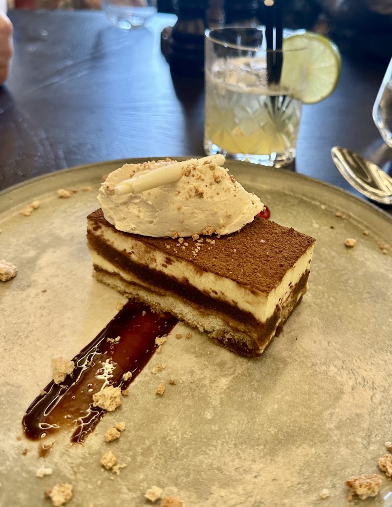 Appetites suitably whetted, mains arrived quickly with my roast sirloin joined by pork loin as I took the opportunity to double up. Pressed lamb shoulder came to the other side of the table and a kids’ roast arrived at just the right moment to head off another chant “but I’m hungry now”. Side dishes were plentiful with cauliflower cheese, greens, Yorkshire pud and jugs of gravy present to augment the roast potatoes and roots on my plate. The lamb was served with baby broccoli and beans with a delicately layered potato terrine catching the eye and a hint of marjoram in the sauce. The lamb fell apart with tiny provocation and was as tender as hoped with plenty of depth of flavour. The potato, sauce and greens came together merrily too, making this a pleasing plate to tackle. A Sunday roast is not a ‘tweezers’ dish and thankfully there was no sign here of undue attempts to over-finesse things, not to say that this wasn’t a well put together dish though with the generous slices of meat shielding roast veg from view and an indecently crispy shard of crackling for a hat. The picture was completed by a generous Yorkshire pud, and the sides all hit the spot. Thinking about it now, I must make cauliflower cheese more often… The gravy was lustrous, deep with flavour and plentiful to finish things off perfectly for mains. Tiramisu and chocolate brownie were a suitable adjunct to the meal and well executed, the tiramisu in particular being light and compelling.
