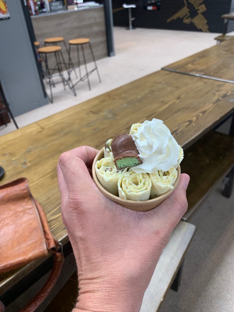 To finish on a sweet note we called by Scrapes for ice cream and brownie. I’m not quite sold on the advantages of making ice cream by hand to order but, regardless of the theatrics, my mint Aero ice cream did everything demanded of it as did a hot double chocolate brownie.
