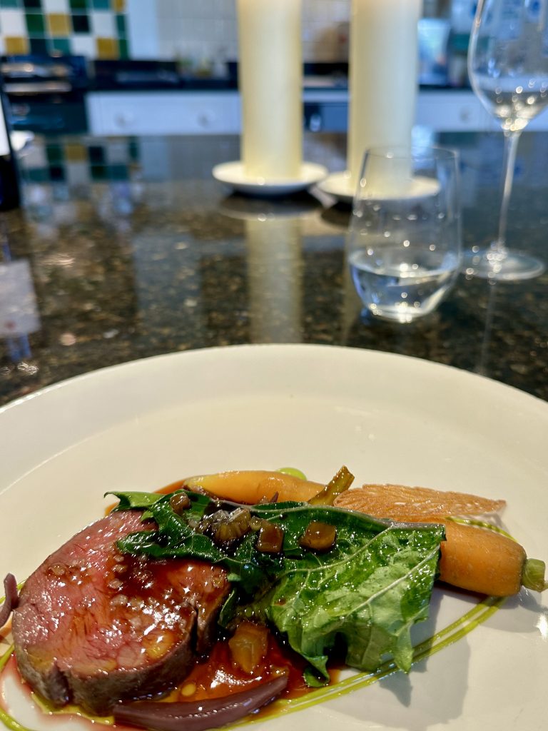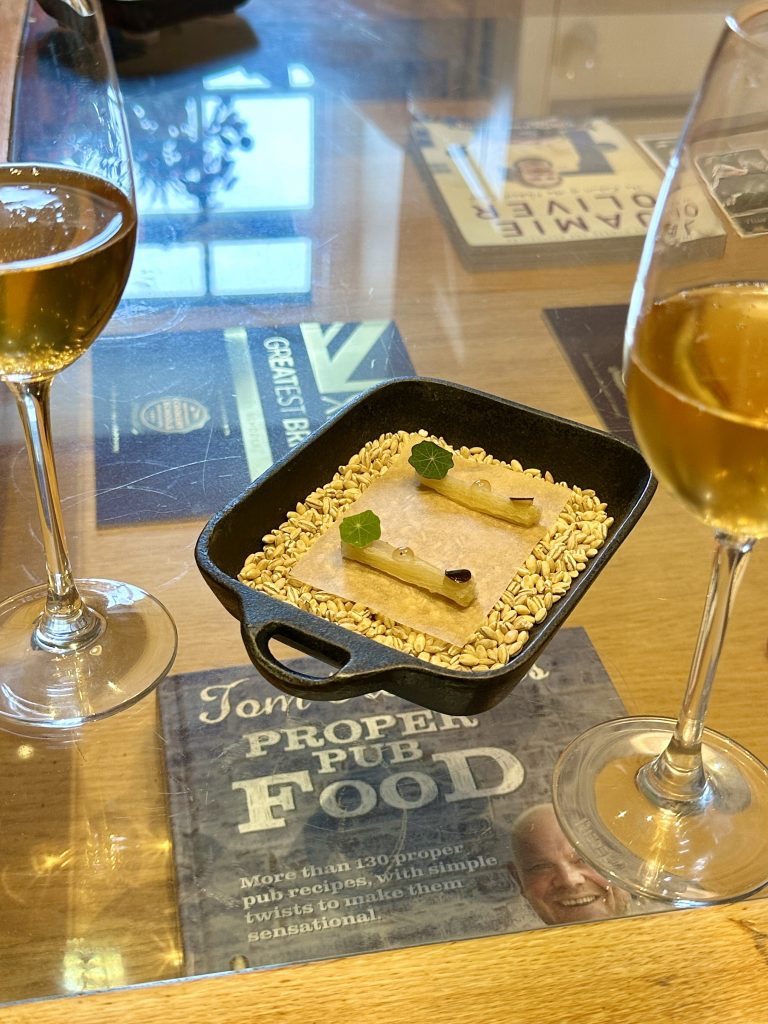 The approach to Swinton Park on the Swinton Estate is suitably grand and features quite improbably picturesque herds of deer calmly surveying the scene while admiring one another’s splendid antlers, one assumes. Post meal we would get a tour of the wider establishment but first up we made our way over to the site of the Cookery School to make our acquaintance with Josh. It’s a relaxed space with a wide central island giving us plenty of space to sit side by side with a great view of the action. Before taking those seats we made ourselves comfortable in a snug corner area for snacks accompanied by a glass of local cider. The snacks were a puffed piece of beef fat coated in wild garlic and a dainty lozenge of salsify, both great precursors to the plates to come and more than enough sustenance to fortify us for the dozen steps to our seats.