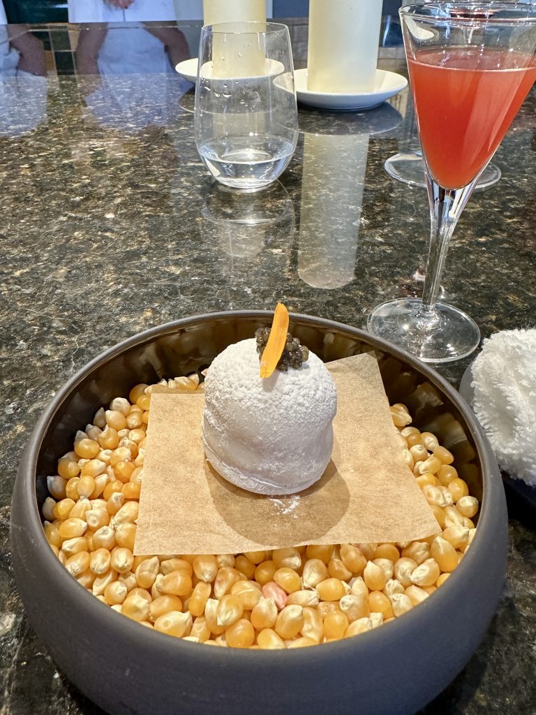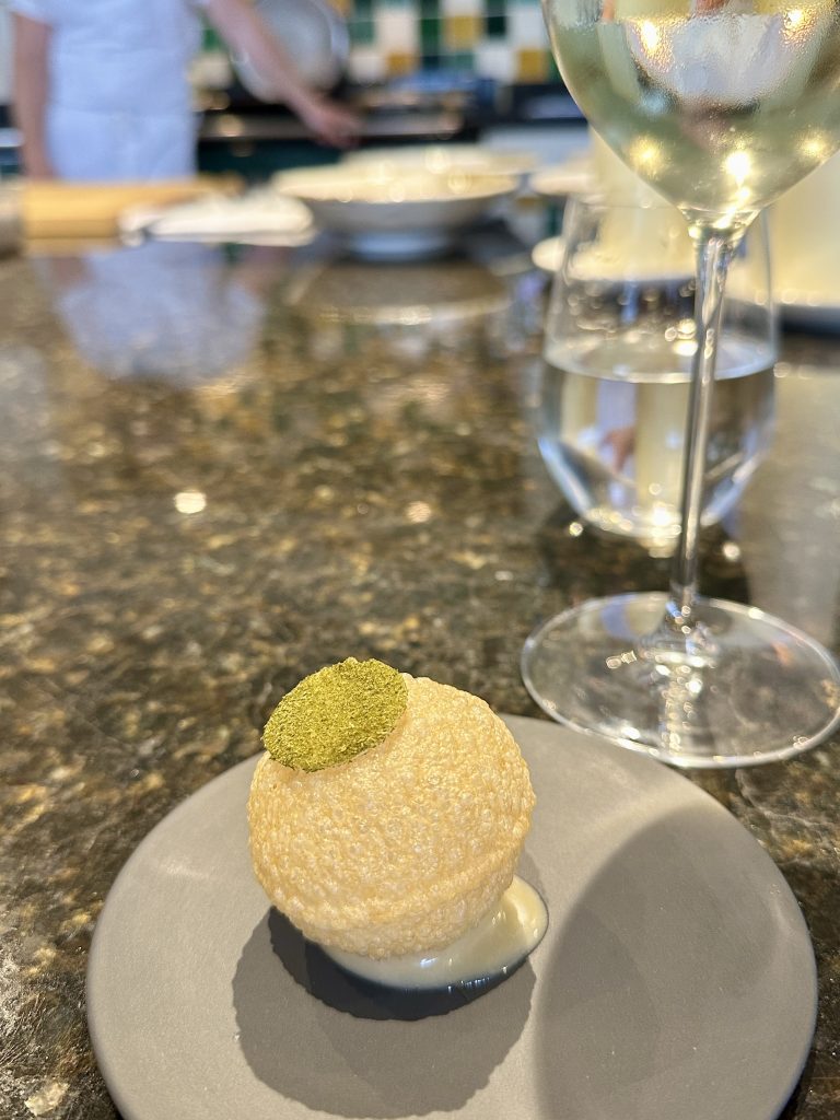 The first sweet dish was a mochi paired with kombucha and raspberry while a touch of luxury and salinity came from a dab of caviar. The texture of some mochi can be a touch gelatinous and unpleasant but this was a perfectly executed example, hardly a surprise at this stage of the proceedings, which set the stage for a final sweet dish. The use of savoury in desserts has picked up momentum over the last few years so the appearance here of chicken of the woods is less of a surprise than it might once have been, the mushroom notes rounding out the sweet milk ice cream and touch of bitterness from shards of brittle biscuit to come up with a truly impressive and original final course.
