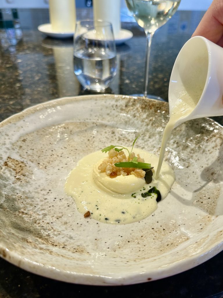 The meat course showcased beef, with carrot and cabbage also on the plate along with a delicately constructed leaf and accents of both wild garlic and lovage. Again everything was allowed to reach its full potential but the starring touch was a lustrously indulgent beef sauce that used chunks of slow cooked beef tendon to give it a uniquely characterful richness. Tendon might not sound like the most indulgent ingredient but you’ve got to admire Josh’s boldness in leaving that word on the menu and not coming up with something more palatably euphemistic.