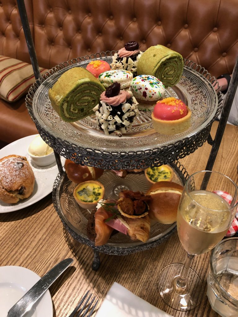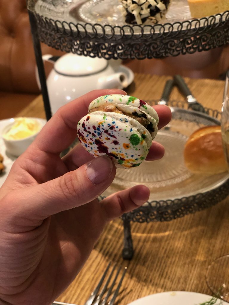 With the lower tier cleared, we started about the sweet elements while enjoying all the tea we could possibly want. The cakes were certainly pretty and the taste lived up to the presentation. The “Tutti Frutti” macaron was a delightfully speckled mouthful to start off (though don’t hold them too long, the food colouring runs and turns your thumb embarrassingly yellow) and all the more satisfying when followed with a pistachio pin wheel that brought to mind a rather more prosaic Swiss roll in its presentation. My favourite was the rhubarb and custard tart which didn’t let the acidity of the rhubarb overwhelm the sweet custard.