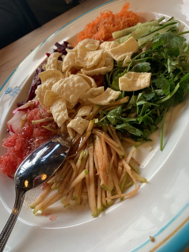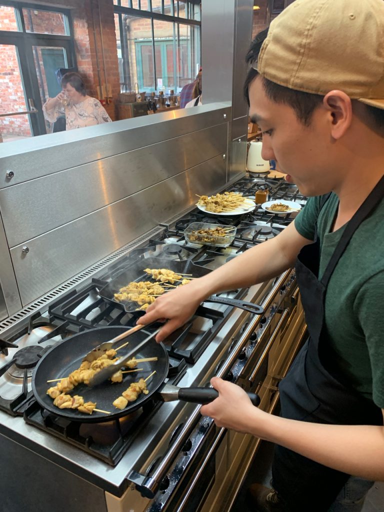 After two years of growth, it was only appropriate to celebrate so Mak Tok teamed up with the newly relocated Malton Cookery School for that second birthday and I made my way up on a Saturday night to join in the fun. The event started rather unusually for a chef’s table with a musical number from the multitalented Mak Tok founder and his guitar. He then mixed a selection of finely cut vegetables and fruits with rice crackers for texture and a dressing to make “Auspicious Salad”. Plenty of fresh coriander helped make up a fresh tasting salad with carrot and apple that set the scene for the next course of traditional Malaysian Satay.
