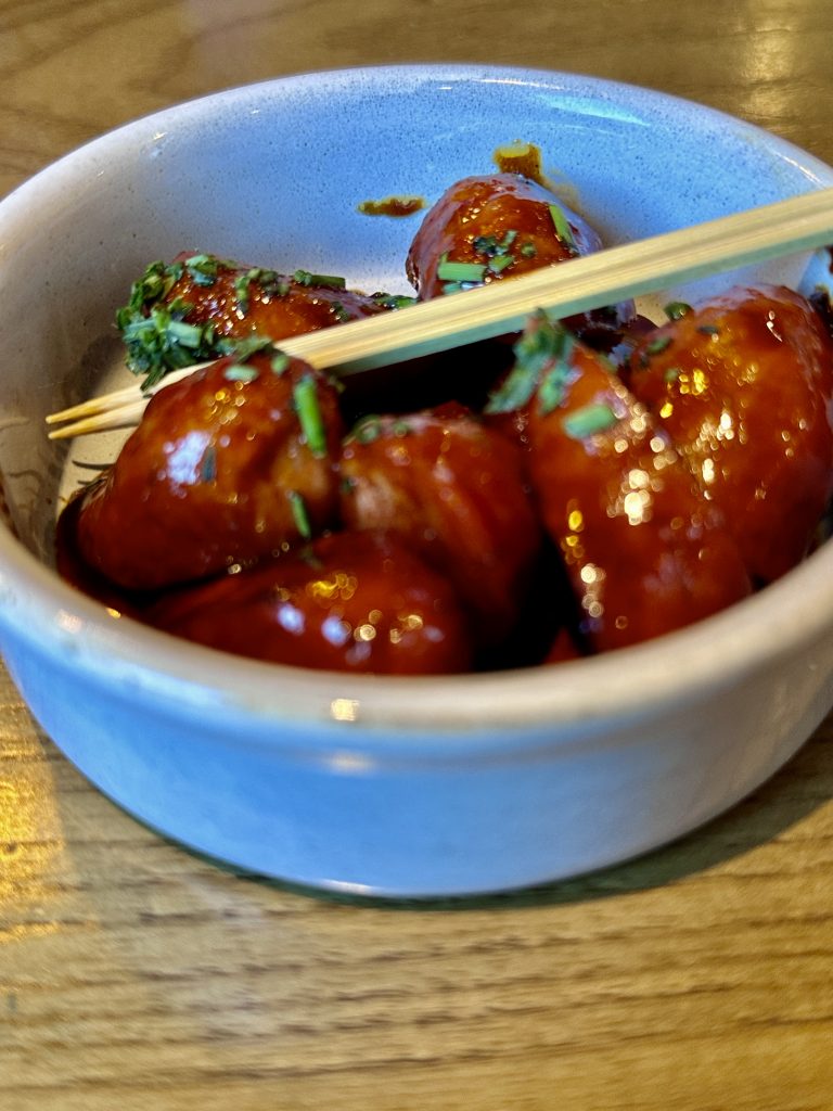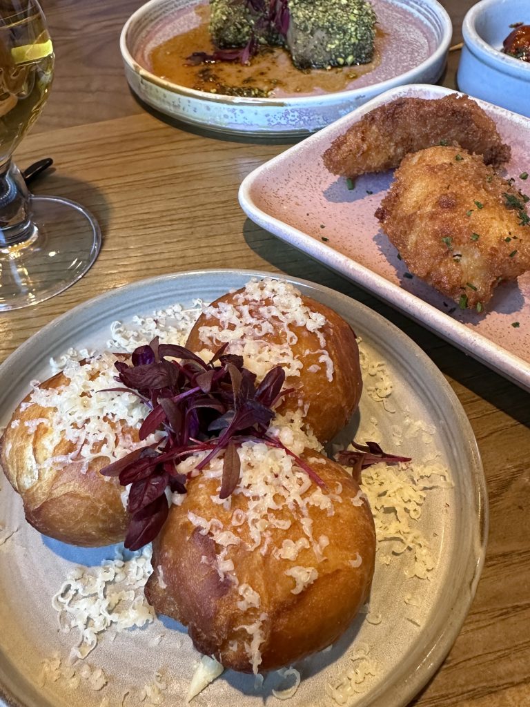 Everything Lishman’s of Ilkley make is pretty peerless so a bowl of their Yorkshire Chorizo in red wine and honey reduction was first to be ticked off the list, arriving quickly. In all honesty, it would have been a feat to make this disappointing but the gentle chorizo spice paired with the rich sauce nicely and let the quality of the meat come through. Monkfish cheeks were crispy and with a satisfying chew and a curry sauce which was a bit more aggressive than the descriptor used on the menu, but cautious application of the sauce balanced things back up. Fountains Gold cheese donuts were next to arrive, liberally topped with more grated cheese and with a warm soft centre making a quality bar snack.
