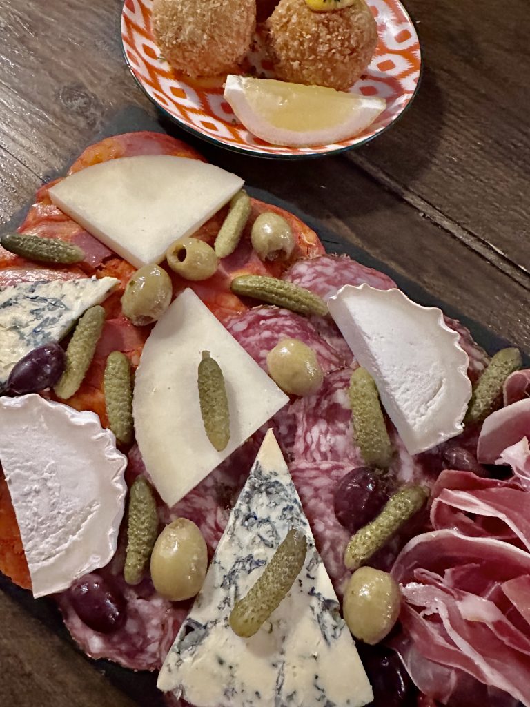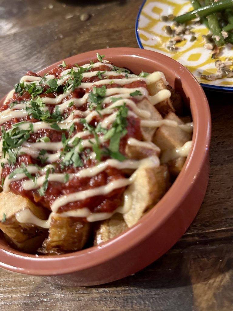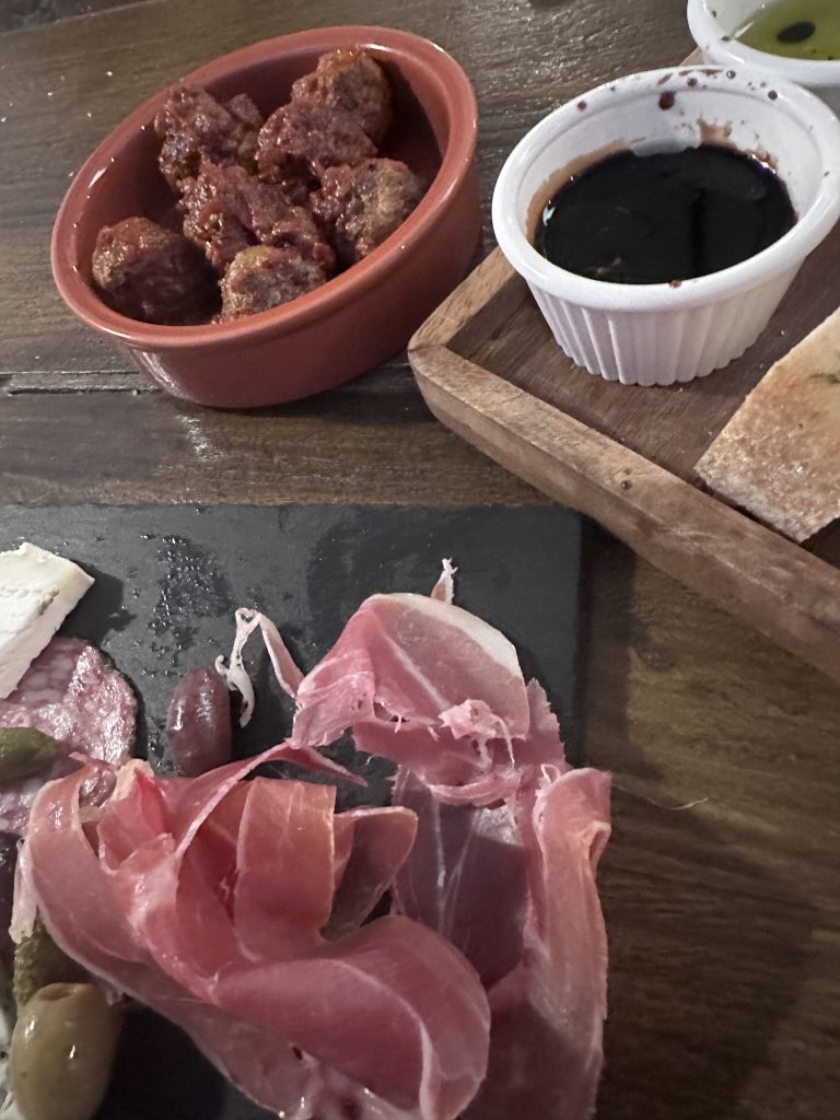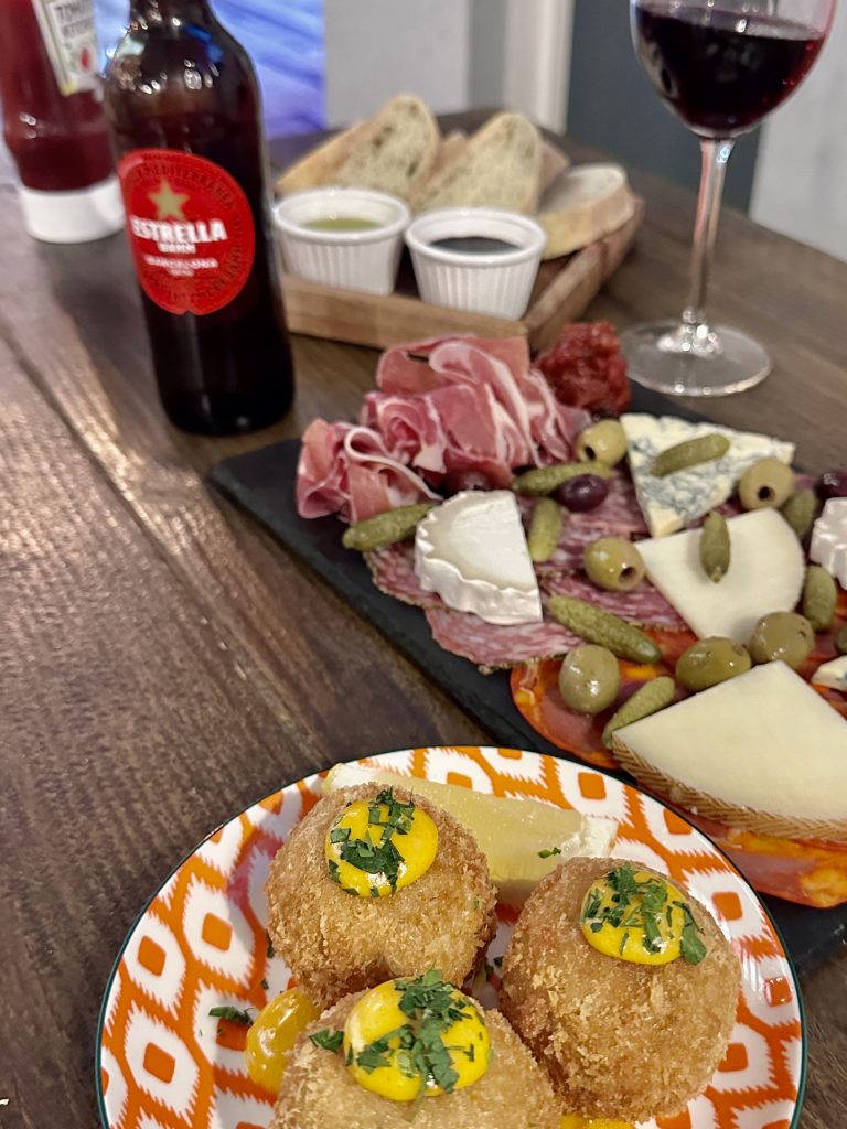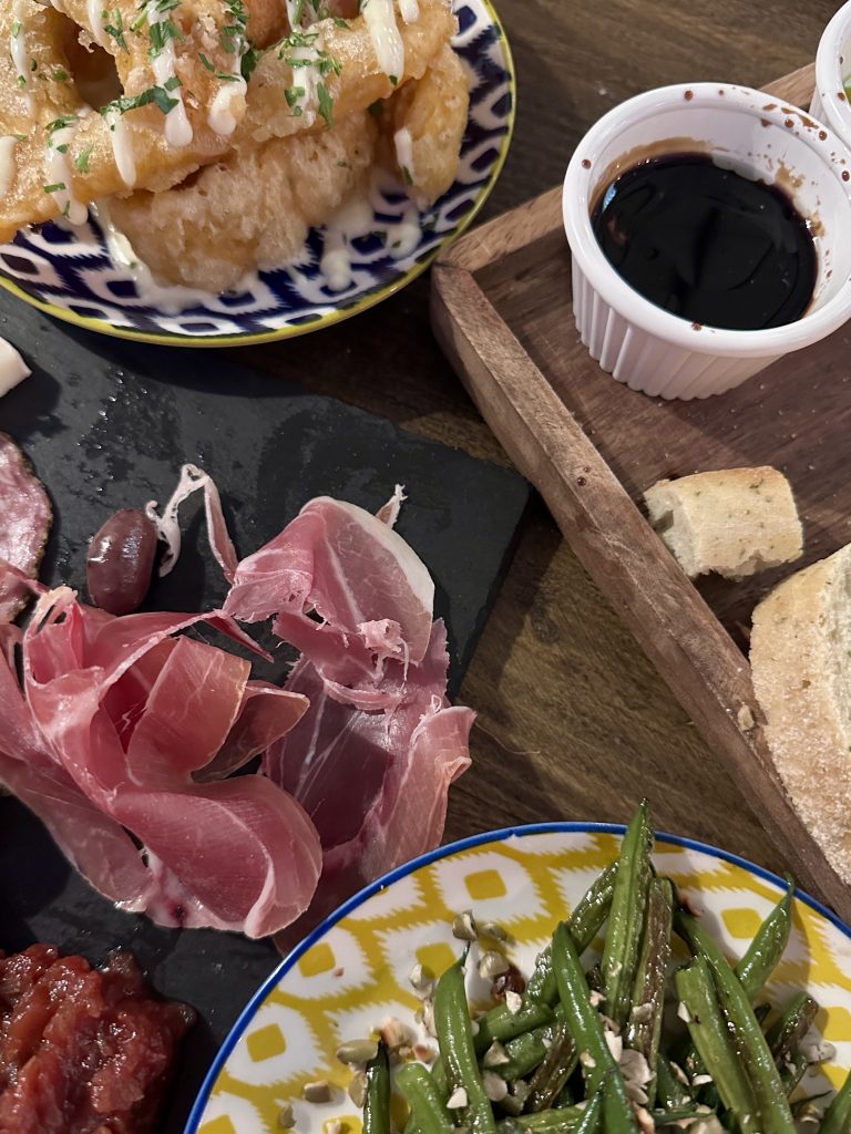 First to arrive was a generous platter of Spanish meats and cheeses generously scattered with olives and cornichon that was perfect grazing while the other dishes shuffled onto the table, starting with salt cod croquettes with a saffron dip that were crisped to perfection externally and unctuous inside with plenty of cod present and a deep hit of saffron to add breadth. Albondigas came next with a rich tomato sauce and generous notes of garlic while we also grazed on bread with olive oil and balsamic, a satisfying trio that’s slunk back from its ubiquity a decade ago. Green beans sautéed with more garlic and some pumpkin seeds dropped next along with calamari rings, something that can trip up this sort of menu. No such worries from Sam though as they were blessed with a satisfying crunch, soft calamari and a powerful lemon mayo for balance. That just left patatas bravas which had been executed to the same high standard with crispy potatoes paired against a good punch of heat from the tomato sauce.