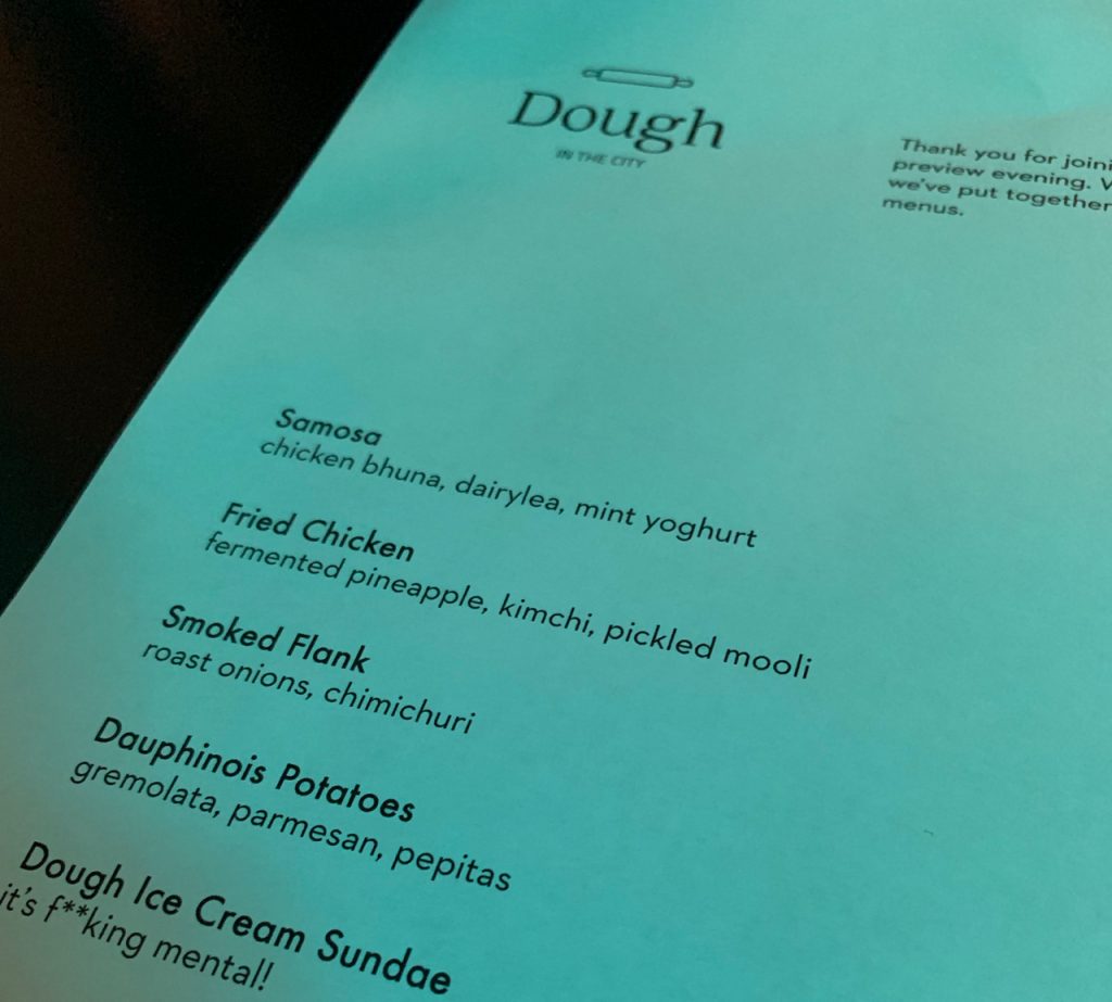 Key to the kitchen here is Jonathan Hawthorne, whose working relationship with group director Luke Downing seems to be paying dividends for both parties. Jono is known for not so much pushing the boundaries of convention as failing to see them entirely, leading to dishes such as cheeseburger spring rolls and the “hangover cone” that has become something of a signature for him. In that context, it’s not a surprise to find the menu at Dough features some unexpected ingredients such as Dairylea. Previous form suggests that, while Hawthorne clearly likes to shock, that’s not at the expense of enjoyable food. I went along to the preview evening for Dough to make sure.