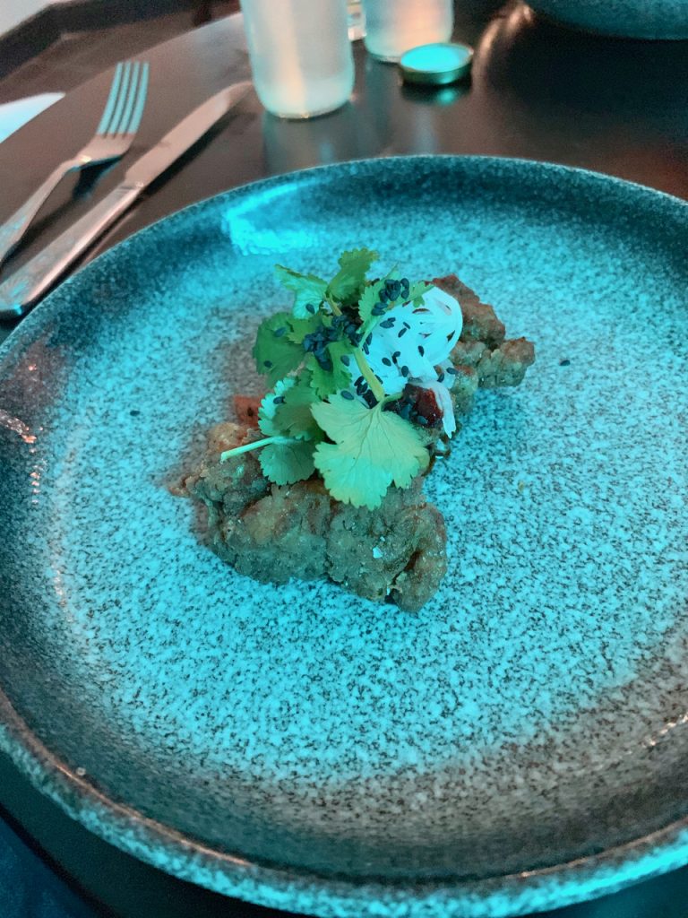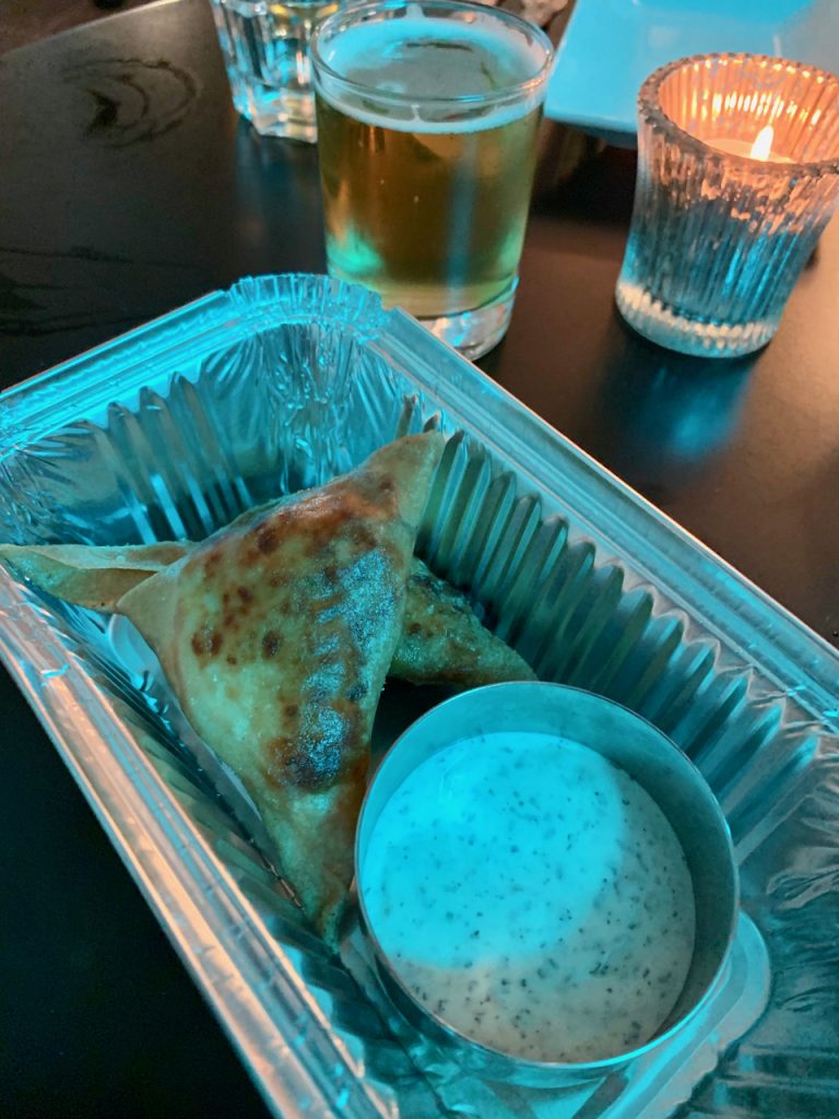 On the night I attended, it was clear that the next few days were going to be key to the opening of Dough, with more than a passing resemblance to a building site. I’ve seen that the full opening happened on time though, no doubt a result of the kind of work ethic that opens restaurants with impressive speed. We were due five courses to showcase the range of things one can expect from Dough in the City, first of which was a chicken bhuna samosa with a minted Dairylea dip. With a cold beer paired, this one would be ordered by the bucket load as a bar snack if it was available in my local, something I seem to remember also saying about the cheeseburger spring rolls at Feed.