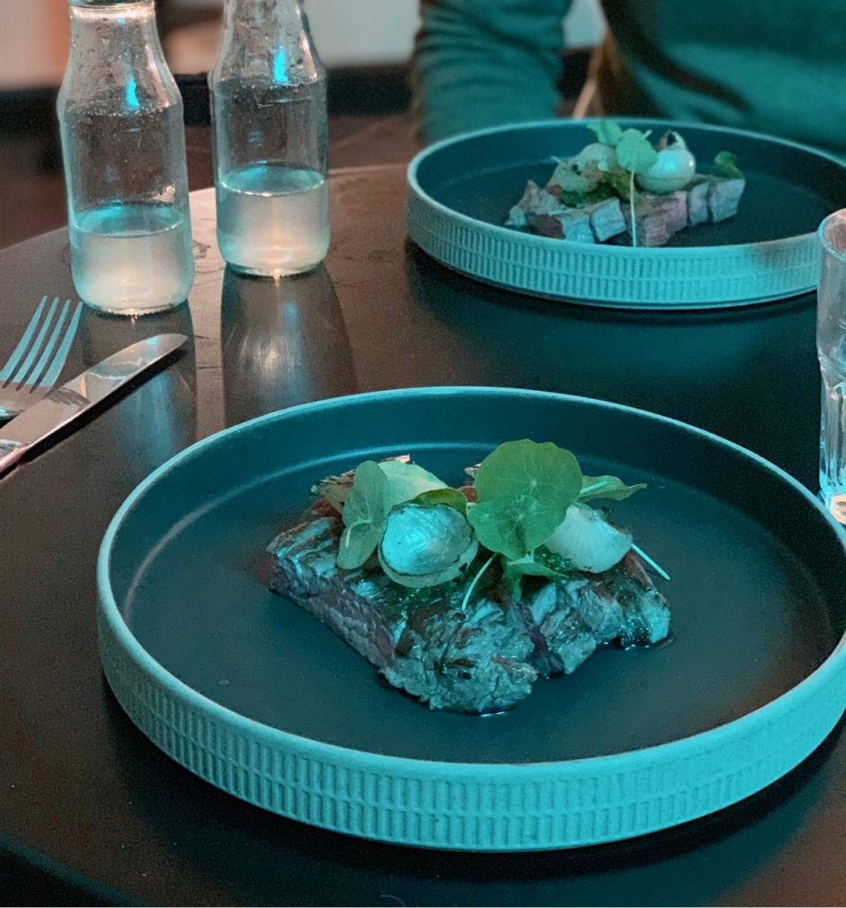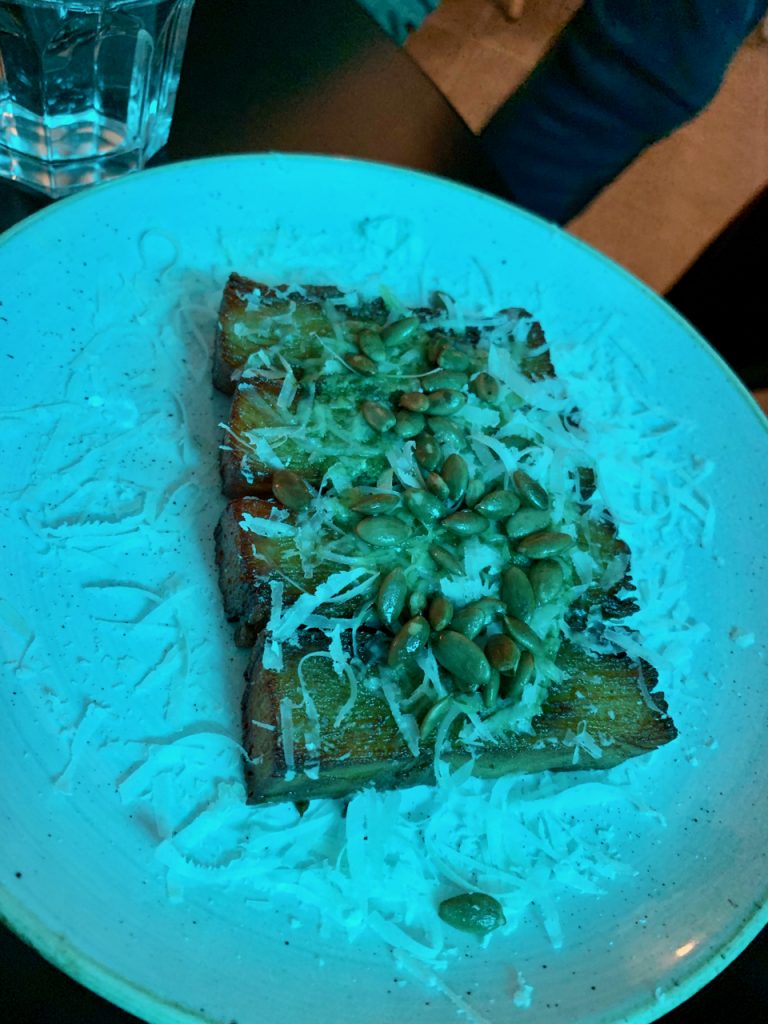 This was followed up with a fried chicken dish that used pickled mooli and coriander to drive out more flavour along with, potentially divisive, fermented pineapple. This was followed up by smoked flank steak with roast onions and chimichurri, both plates coming together well and the pickles/ferments only adding to things without jarring. At the side of all this came dauphinoise potato that really brought the beef to life. Shot through with gremolata, the paper thin slices of potato were topped with pumpkin seeds and topped generously with parmesan then cut with perfect right angles to present neatly.