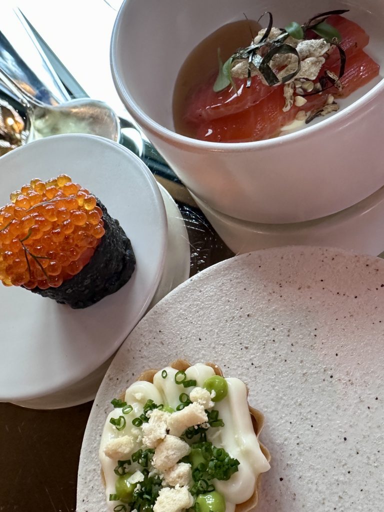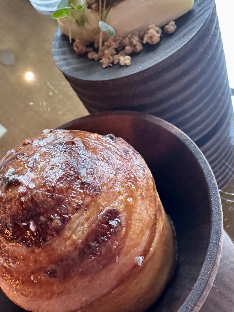 Named after The family home of Winston Churchill, Chartwell, and with menus given designations based on his preferred cigars and drinks the marketing here invites you to expect the unexpected… Opting to avoid an excess of intrigue we broke the wax seals and buckled up for the “Romeo” 7 course menu, taking its name from the Romeo y Julieta cigar of Winnie’s preference. One of the first things to draw the eye and most striking features of the dining area is a large screen embedded in a mirror that shows a variety of angles from the kitchen, acting as a subtly voyeuristic twist on an open kitchen viewed through a looking glass. The rest of the dining room is bright and welcoming with an expansive (and indeed expensive) feel amplified by slightly reflective table surfaces and swathes of books, which would feature later in our evening. First up was the customary round of snacks: in this instance featuring Lincolnshire poacher, sea trout and allium across a delicate tart; a nori wrapped parcel; and dressed trout. Delicate additions of emulsions, herbs and the odd bit of dehydrated crunch helped them all stand out and make a strong start to proceedings in advance of a bread course. Cheddar brioche with whipped roasted chicken butter sounds like an easy way to win me over, and so it proved. It was nice to see a relatively conservatively portioned bread course too; filling up on bread when there’s so many memorable dishes in prospect being an occupational hazard that can lead to a distressing waste of bread.