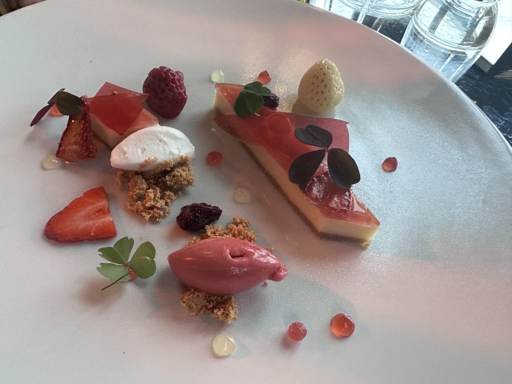 Next up was the meat course, centred around duck with plentiful notes of truffle as well as asparagus for freshness and lightly pickled mushrooms. The duck cookery was perfect with the fat rendered, skin crisped and flesh still pink and the elements served alongside it complemented rather than clashed with the duck. The pair of sweet dishes on which the menu ended focussed on passion fruit and strawberry with the former represented by a bite-sized, delicate tart and the latter a wide range of textures with the cheesecake element being particularly memorable.