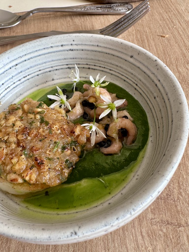 Thomas Carr at The Coast is twenty something covers across two small rooms with view out across the hills and, thanks to the weather when we visited, large opening doors that bring nature just far enough inside to be part of the experience, making a delightfully calming space in which to dine. Our server was quickly at our side with menus and water, and wine for the passenger in short order while we settled in and contemplated the dishes that would make this Friday lunch rather special. The Tasting Menu that we were being treated to came in at £65 a head and had some real star ingredients to easily justify that price. Bread came to the table first with a trio of flavoured butters comprising tomato and basil and beetroot as well as a rather more unusual mussel butter that reflected the seafood theme nicely. With that to pick at, we had a treat from the chef arrive to kick things off. Sweet and buttery scallops with a hazelnut crust alongside brown shrimp with a watercress sauce and sweet hints of white onion and a little kick of wild garlic resolved into an light, well balanced and beautifully executed dish that set the tone very well.