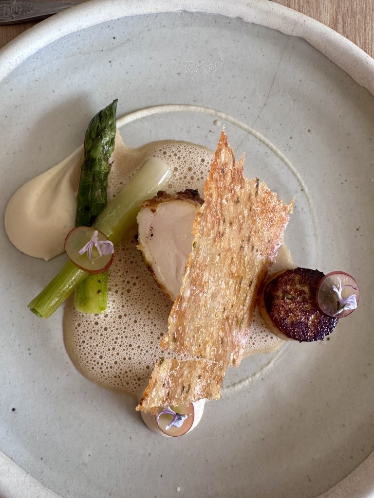 Monkfish was next up in this parade of seafood greatest hits with a bacon sauce underpinning it in lieu of the more common pancetta or similar wrap treatment. Asparagus and baby leek gave a freshness and a splash of green to the place while texture was taken care of by a generous shard of crisped chicken skin. What really pushed this one to new heights was a lightly spiced piece of chicken sausage that livened up the plate even further, with a gentle Coronation chicken spicing that was in perfect harmony with the other elements on the plate. Dessert was anchored by passion fruit with textures of meringue and a crunchy base, a light and zingy finish to the meal.