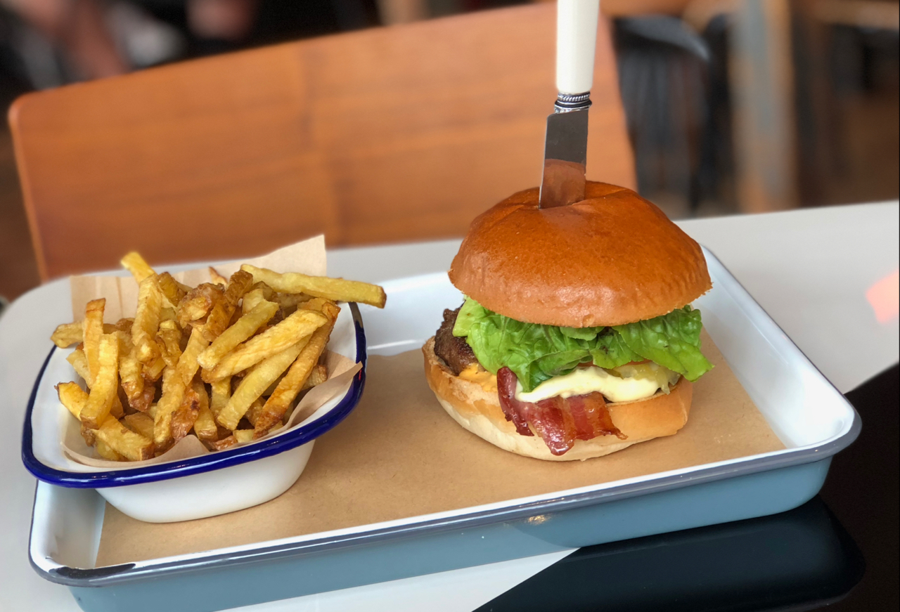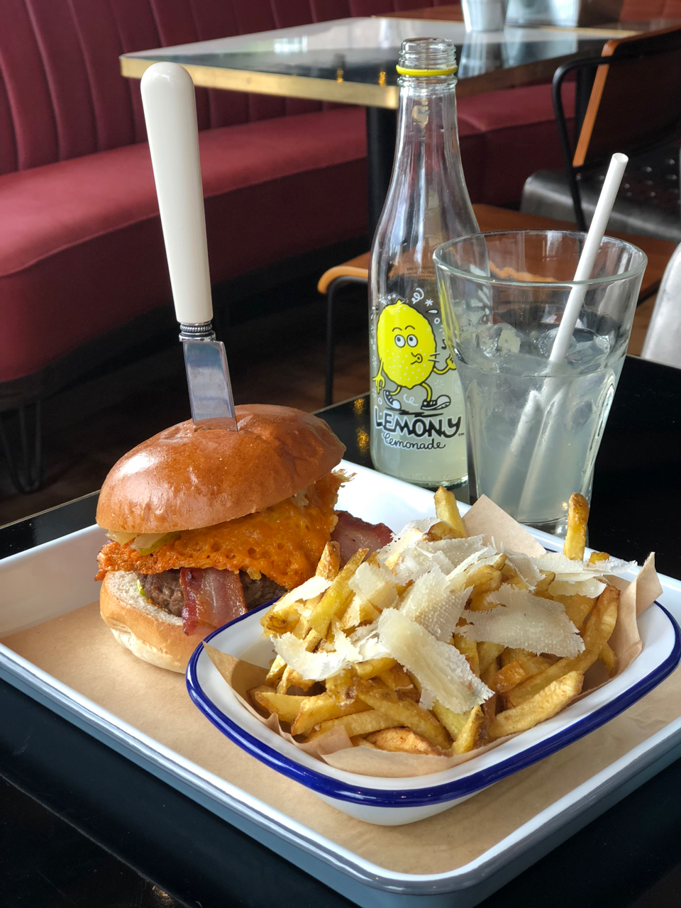 We went for a house burger with blue cheese and a “1216” that packed harissa mayo and fried potato scraps along with Red Leicester and bacon. We chose regular and truffle fries to go with our burgers and made it through the brief wait with the aid of decent coffee and a cloudy lemonade. When our food arrived, we found the burgers presented with a knife impaling them rather than a skewer, perfectly attractively presented. It was only a pound extra to add bacon to the house burger so I didn’t think twice about adding the extra layer to go with the beef, cheese, pickle and lettuce. The 1216 (Sorry, I didn’t get the origin of the name) had its cheese presented differently as a square that had been melted and allowed to solidify.