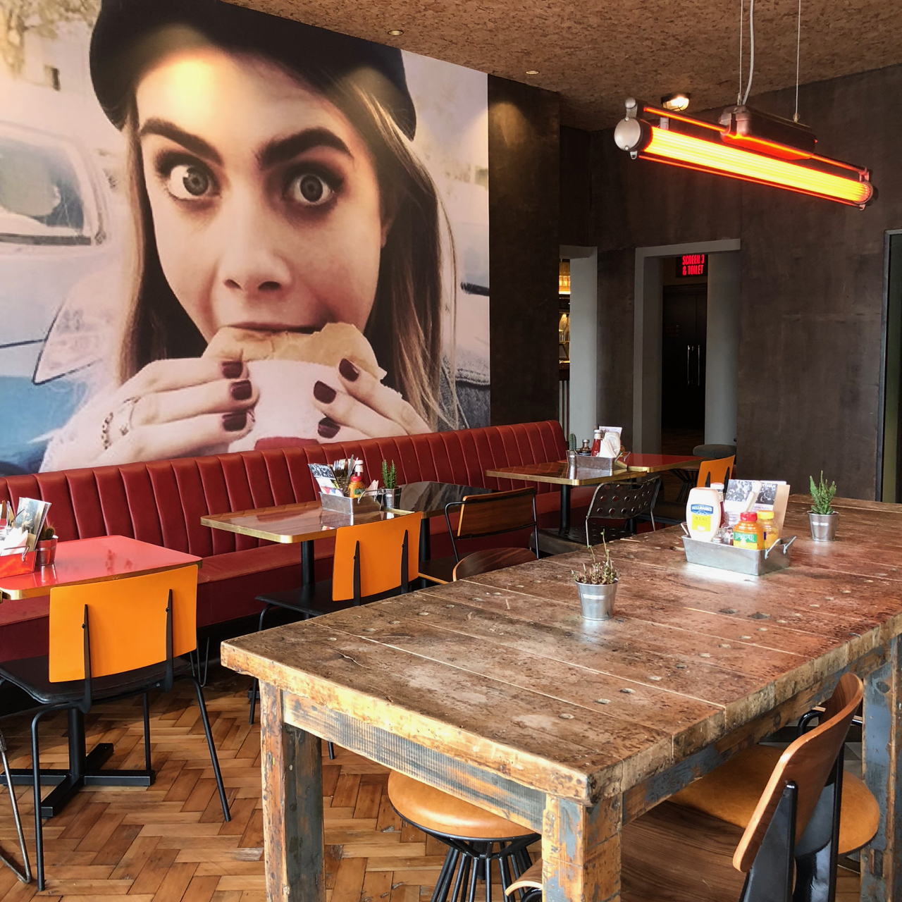 The Spielburger restaurant is separated from the Everyman York foyer and downstairs bar area, making it feel like a different experience sharing a space with those enjoying a drink before their film. It’s not a huge space but it doesn’t feel cramped or like there’re more seats squeezed in than are comfortable. The room is dominated by a large portrait of a wide eyed young person enjoying a burger. I only registered it in passing but others might find her gaze disconcerting should you end up in her eyeline.