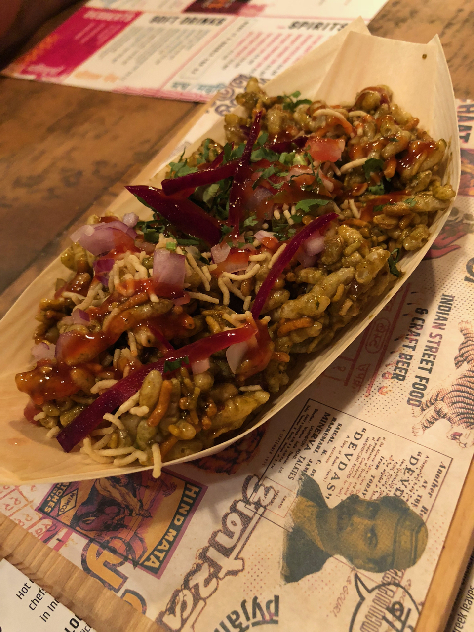 Having a good crowd meant that we could be sure to get through as many of the new dishes as possible, though this meant a relatively involved discussion to choose our strategy. Something that was eased by a few mouthfuls of Bhel Puri, a tangy vegetable and puffed rice snack that seemed to have gained a significant amount of spice since I last tried it. Further help arrived in the form of a dish of Peanut Pakoda, peanuts deep fried in gramflour that hadn’t quite reached their full potential, remaining a little bland compared to the other generously spiced dishes. With these snacks addressed, we got our order in and took a couple of outstanding beers from Leeds based Northern Monk Brewery to keep us company.