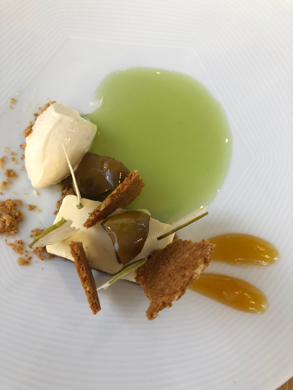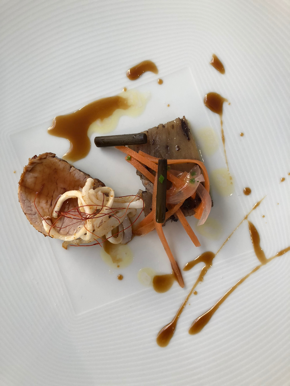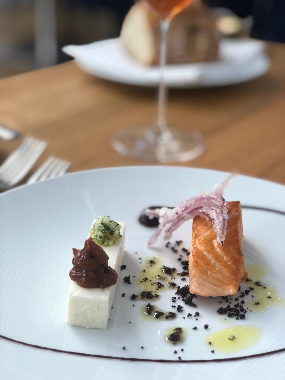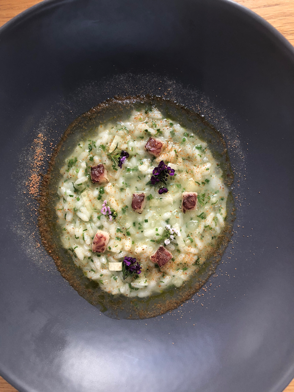 The meal started, or rather continued, with salmon and “Greek salad” which topped the perfect, tender salmon with fried red onion and a piece of light feta mousse that was home to a impressively finely diced cucumber salad. With olive crumb and caramel to finish the plate, this was a simply presented plate on which each element, including the paired rosé, pulled its weight. Next up was a risotto that pulled together apple and smoked eel with melon and home smoked bottarga. Restrained presentation did the dish justice as did the Riesling that confidently grabbed hold of the apple flavours.