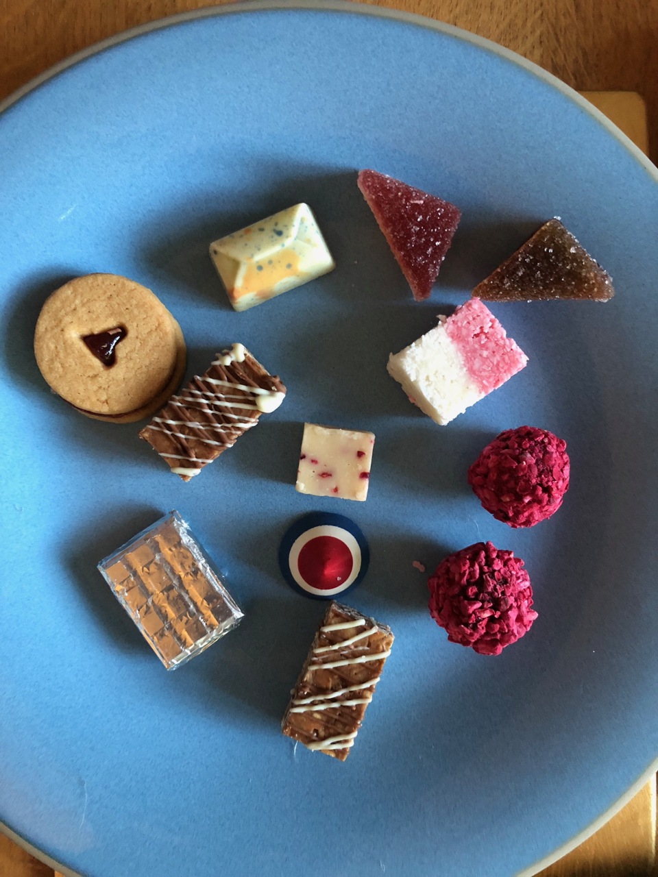 Our dessert was nicknamed “The Veiled Peasant Girl” and threw many variations of apple at us, thankfully without any individual one taking over. This was really just a precursor as far I was concerned though with a show stopping cheese trolley on its way. While the trolley itself couldn’t quite compete with the Mouseman beauty at Harome’s Star, its contents certainly could. Every cheese was sourced from within the British Isles and the passion with which Adam introduced each one was obvious as he reeled off a list of not only the dairy from which they were sourced, but in many cases the name of the cheese makers. The cheeses we chose were presented with crisp breads, an Eccles cake and something resembling one of Betty’s most famous creations. I would happily say that this was a perfect, show stopping, way to end the meal… if it were not for the petits fours. Unfortunately by this point, we’d exhausted the limits of our babysitting so ended up enjoying them at home, but the set of childishly inspired sweets to finish off really was the perfect end.