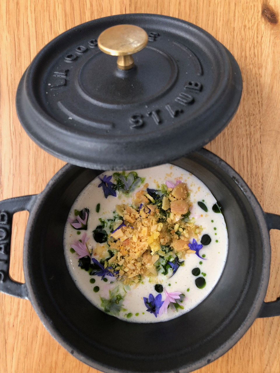 There’s a vein of fun through the Arras York experience that we first started to mine with this plate. I loved the delicate mouthfuls of fish and chips with mushy peas that were accented with strands of lemon, while deep fried rigatoni was stuffed with ricotta and dabbed with puttanesca sauce for maximum impact. Glass noodle spring roll packed in the flavour of curry leaf while deep fried camembert did all the good things one would expect of fried cheese. As we polished off these snacks with obvious enthusiasm, we were served a Jersey Royal and nigella seed loaf that would have sated my appetite rather too effectively had we eaten the whole thing. This was as frustrating as it was truly superb, the leftovers following us home at the end of the evening. Our last preview before getting into the first course was a bowl of cold potato and almond soup with gribiche bits grated egg and almond & bread crunch, again it raised expectations of the coming five courses even higher.