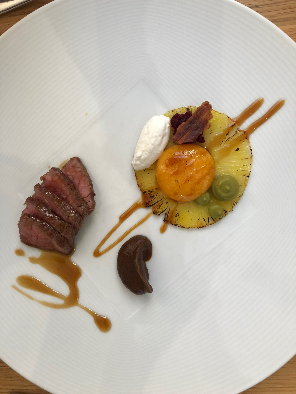 Pork starred in the first of two meat dishes we were served, with pickled veg and a twist on dauphinoise that shot paper thin slices of potato through with five spice flavours. The wine pairings continued to work brilliantly, a fruity Sangiovese this time accenting the Eastern flavours before “a surprising beef dish” came to play. This was a plate with a sense of humour recalling memories of Aussie burgers that, if you’re feeling indulgent, apparently come served with “The Lot”. Each burger topping extravagance was unfaithfully replicated here with obvious passion and blessed restraint. Slices of bavette steak took care of the burger element while pineapple, gherkin, bacon, onion bounced off one another along with a perfect egg yolk that, when burst, swept around the other components. With a Californian Cab’ Sauvignon and Zinfandel, we smiled our way through the plate and prepared for sweet dishes.