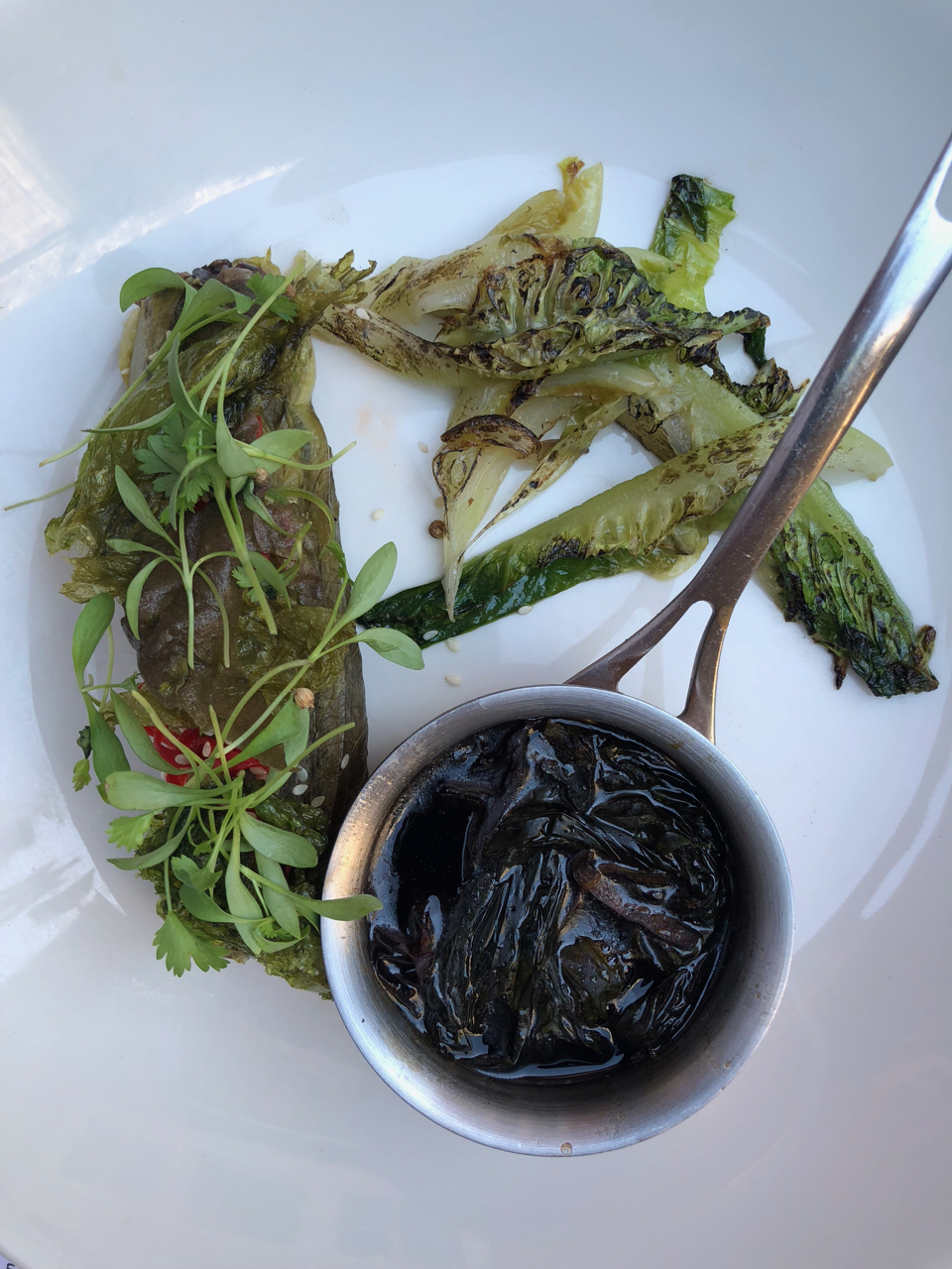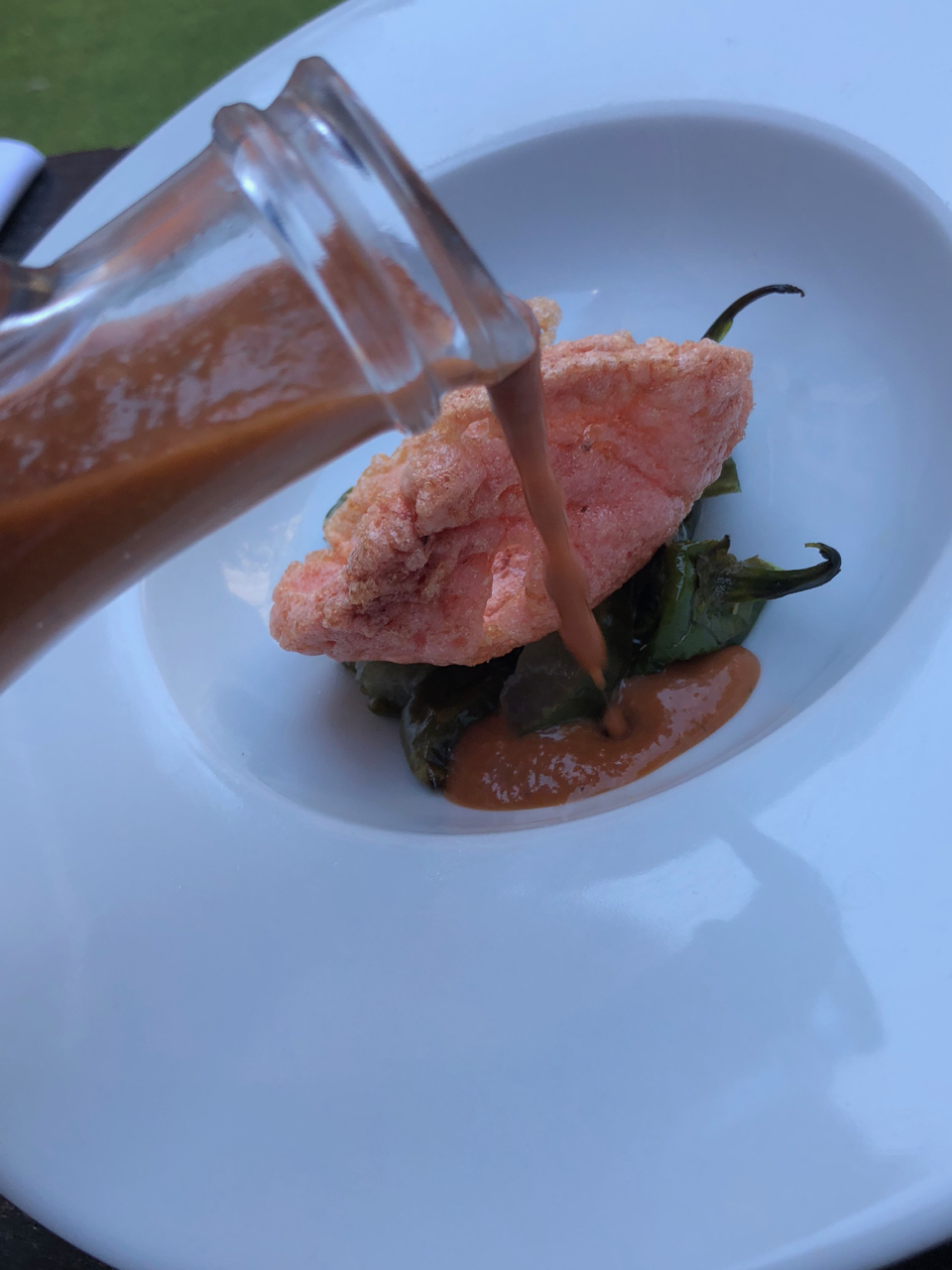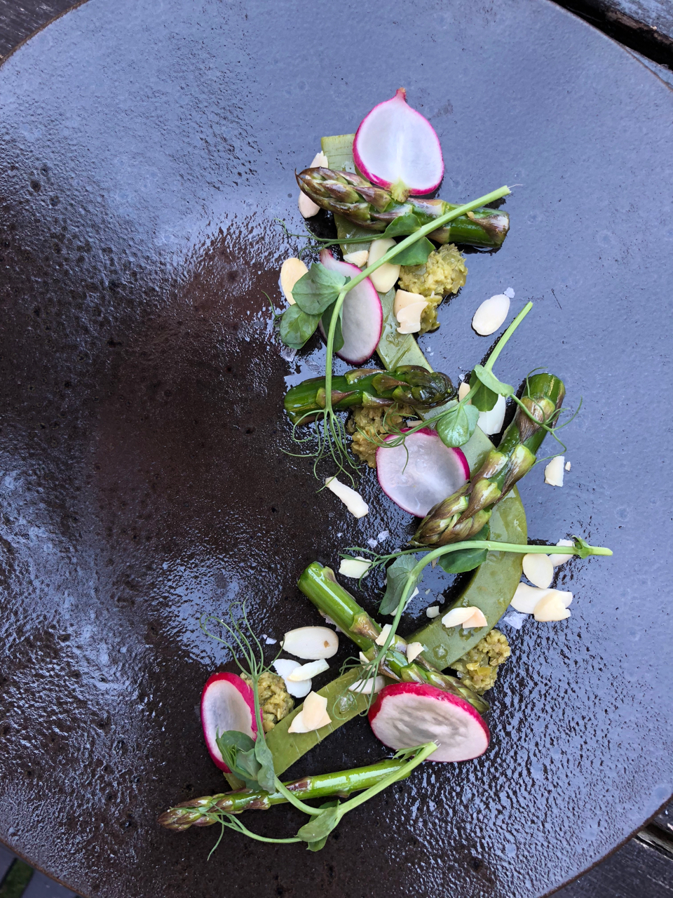 Our first dish was perfect for the hot weather: a Heritage San Marzano tomato gazpacho that was poured at the table over salted padron peppers, fermented cucumber and a beetroot and tapioca cracker. We were sampling this meal at the beginning of the heat wave we’re currently enjoying/enduring, so the sharp hit of fresh tomato did its thing well. The tapioca cracker needed eating quickly to retain its crunch against the gazpacho and broadened the dish well. Our other starter was a, rather more unusual, asparagus and almond milk “Panna Cotta” that snaked its way across the plate under some dressed asparagus tips, slices of radish and an olive tapenade. I was surprised at how small a dent in my appetite this dish made but the elements worked together rather than competing, making for an enjoyable plate and certainly one of the most unusual ways I’ve seen asparagus used.