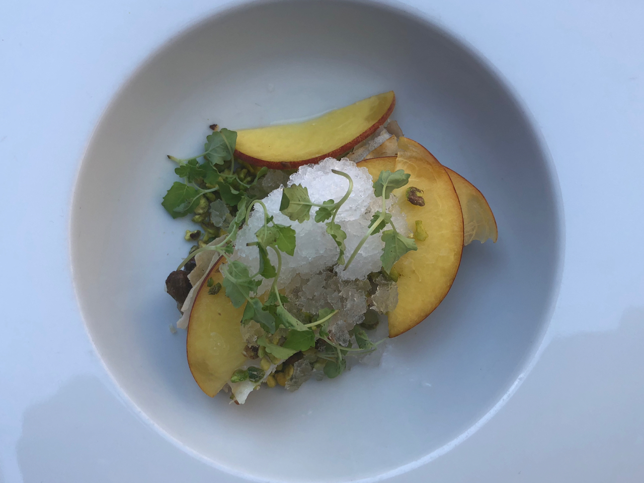 The desserts with which we finished our meal were suitably ornate, starting with a maple and pistachio baklava nestling under slices of peach and a rosewater granita that took the edge off the day’s heat perfectly. Finally an eggless macaron that had been delicately filled with strawberry compote sat along with elderflower, gooseberries and a lemon sorbet that was doomed to a short life in this intense heat. Both dishes demonstrated plenty of skill and judgement from the chef.