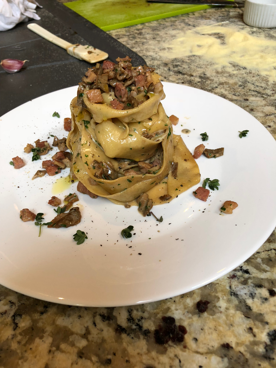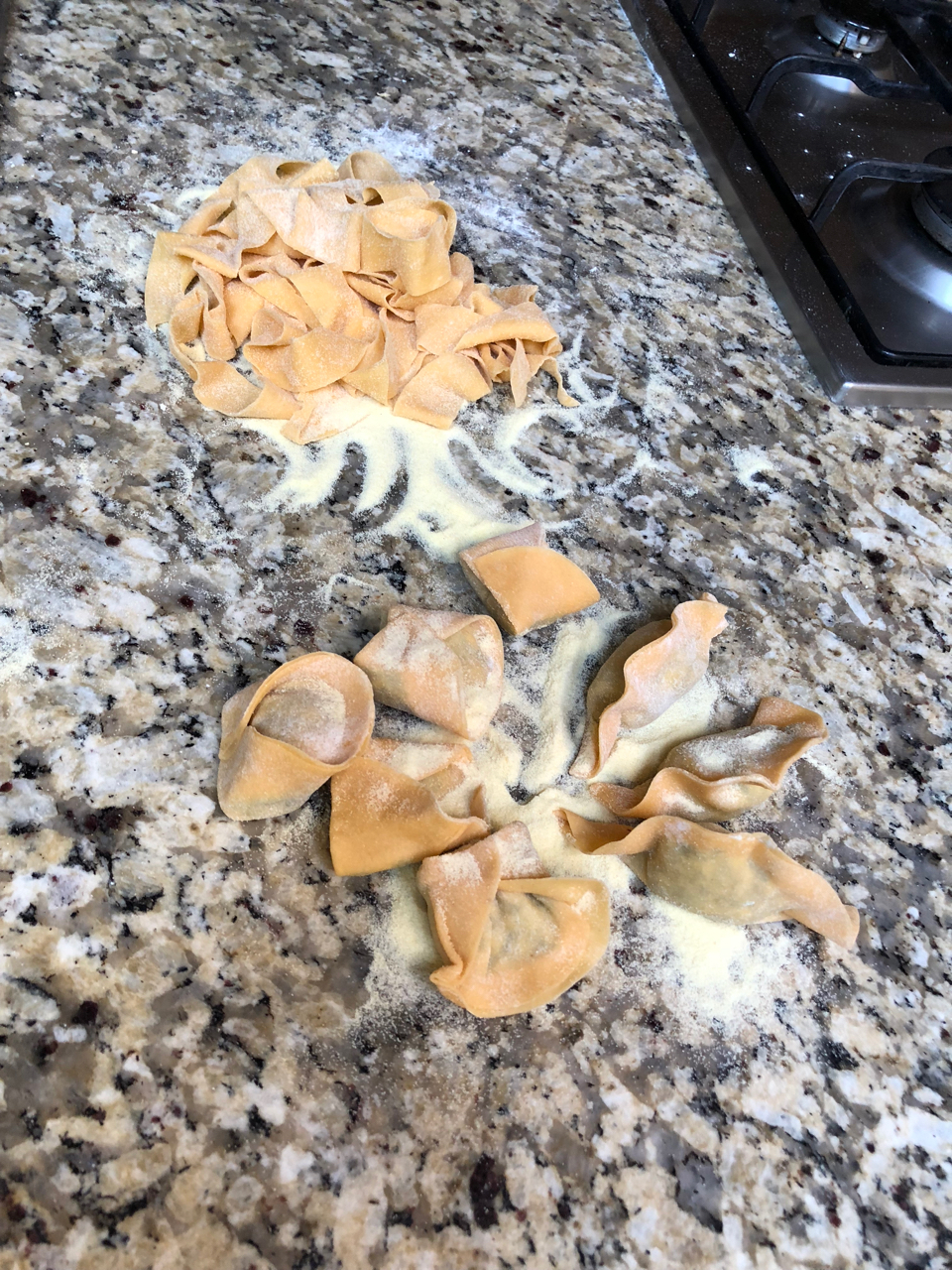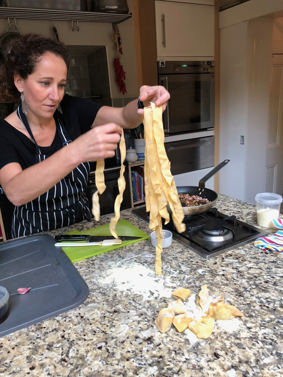 Our efforts quickly yielded lustrous ribbons of pasta that Sara quickly knocked up a mushroom sauce for before expertly twisting the sauce and pasta together into a delightful tower that we wasted no time in getting stuck into. Spaghetti in a simple olive oil sauce with olives was next up for us to quickly dispatch before fiddling our way through constructing ravioli and tortellini. This was a task that was reduced to greater simplicity than one might expect, requiring only a few neat folds to end up with some delightful parcels that required only a few short minutes in water.