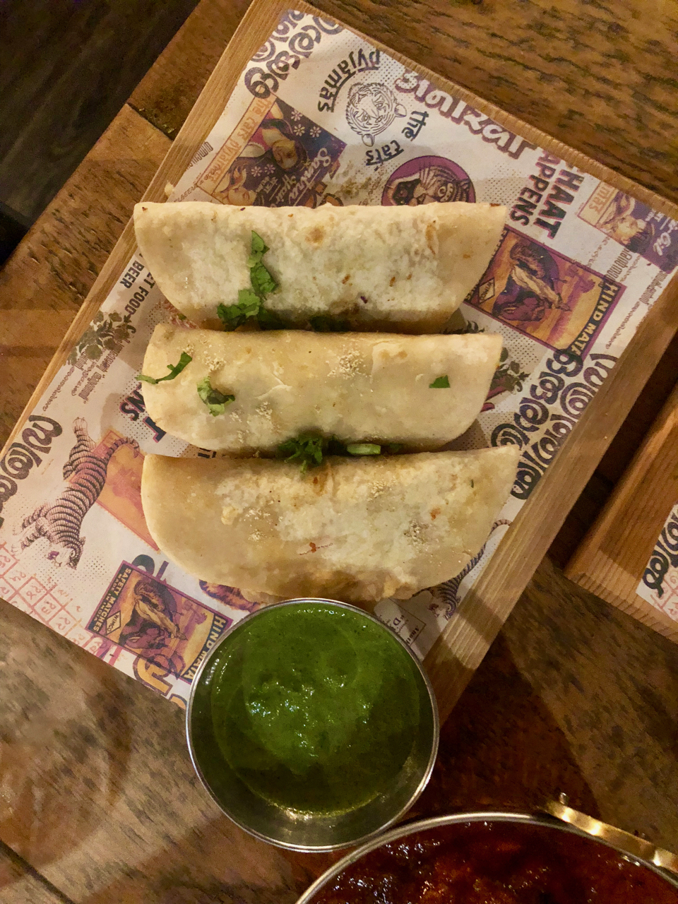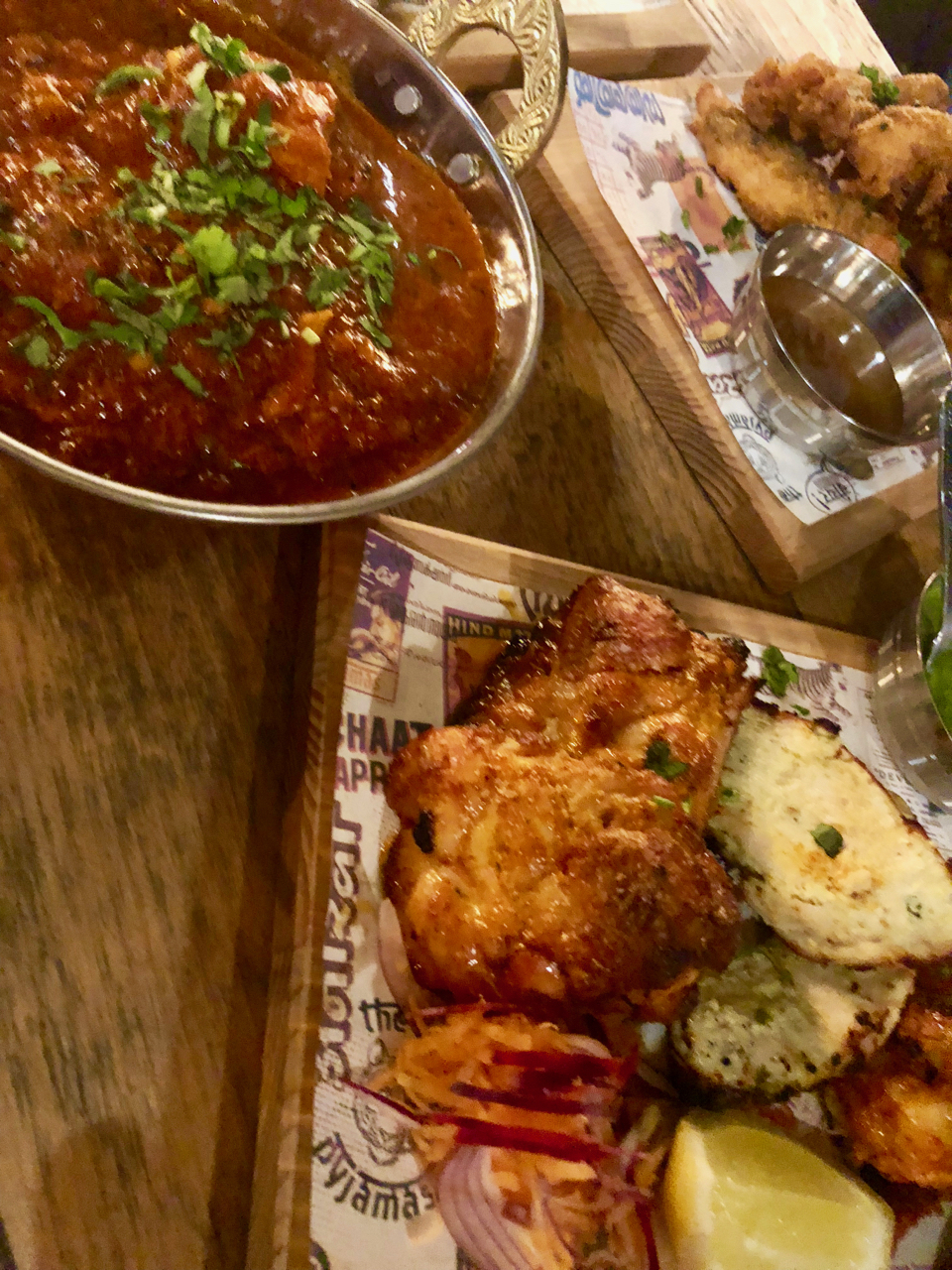 The other two ‘starter’ dishes we ordered were Paneer Tacos and “Chicken 65”. The tacos were unsurprisingly tricky to eat, spilling their tasty filling wherever they like, but delicious with well judged spicing. “Chicken 65” was a spiced twist on fried chicken that hit the spot before we received our curry.