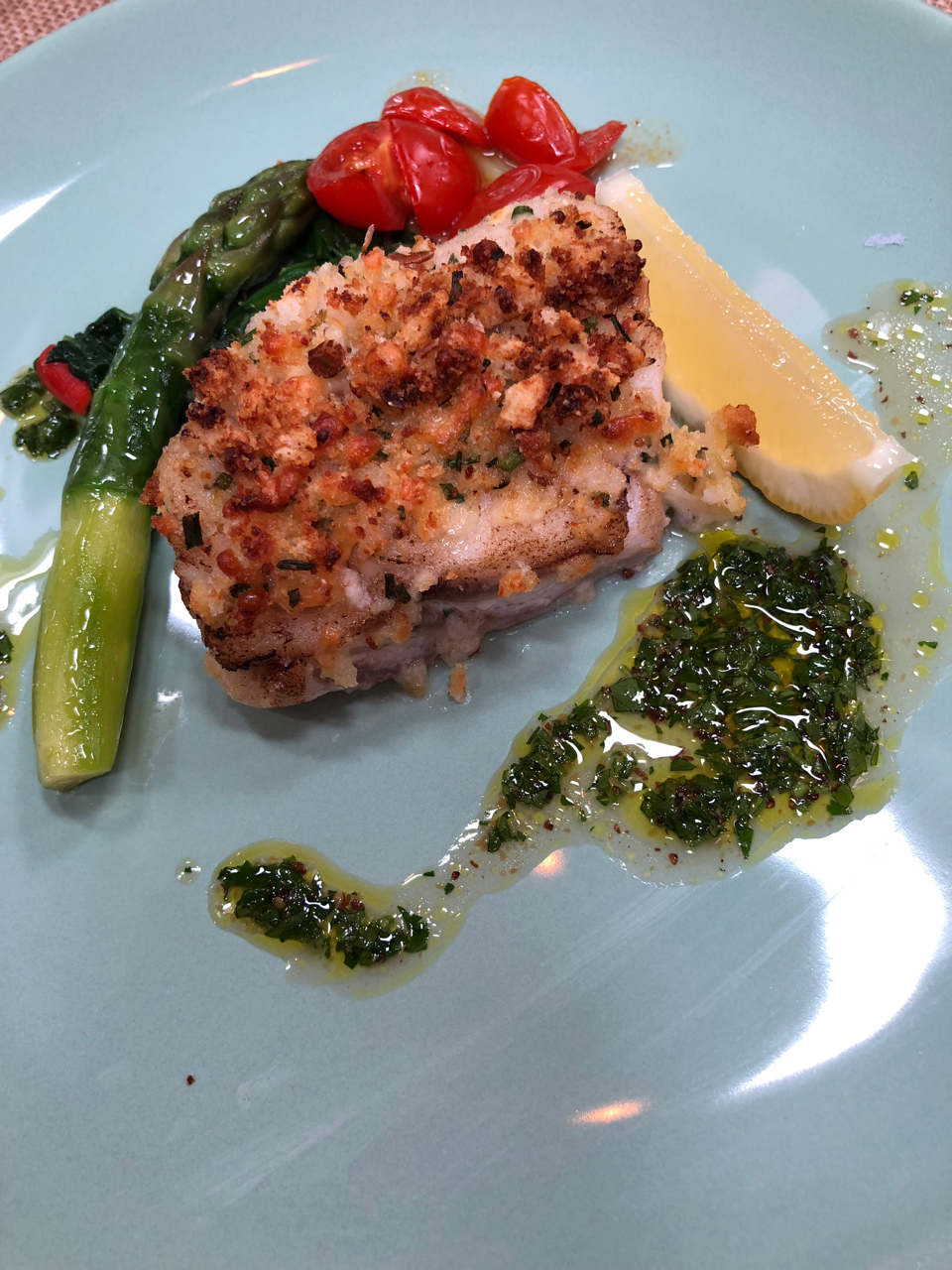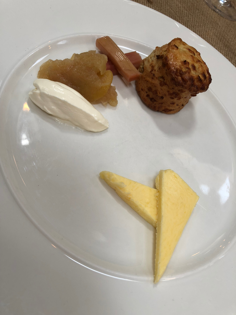 The next target at which Steph aimed the cheese was cheddar and spring onion cakes with tomato relish. Discs of radish gave crunch to the plate before we moved quickly onto the next course which showcased fish. Beautifully trimmed asparagus accompanied cod with spinach and lemon to bring out the best of the fish which had a crispy cheddar crust. Finally we satisfied any remaining appetite through cheddar and apple scones with Yorkshire butter, supported by rhubarb, apple and clotted cream. By this point my ability to eat more was moderately well impaired, but Steph had done her usual great job in putting together a lovely sequence of dishes.